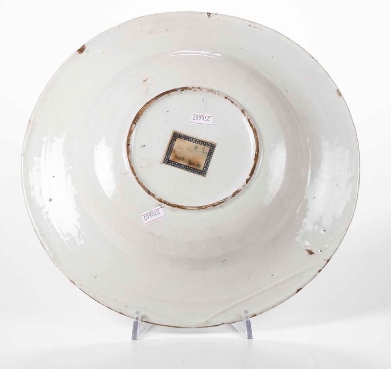 Maiolica decorata in policromia. Marca assente. Diametro cm 33,3. Conservazione: felature o rotture riprese in restauro