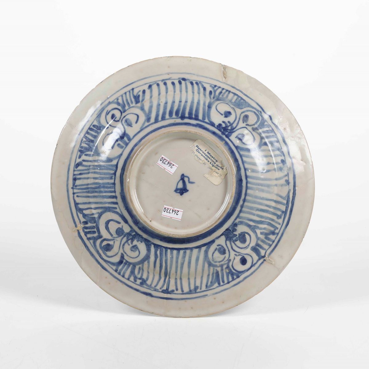 Maiolica. Marca: campanella blu. Diametro cm 29. Conservazione: rotto in più frammenti e ricomposto in restauro. Il piatto è stato esposto alla prima mostra retrospettiva della ceramica ligure di Albisola nel 1968, come risulta dall’etichetta cartacea posta sul verso