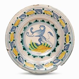 Piatto tondo in maiolica con il decoro con il leone rampante ripresa in formula rapida, corsiva