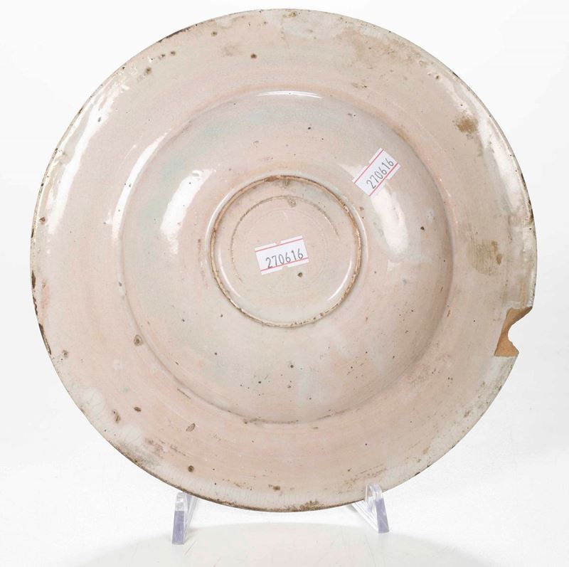 Maiolica. Marca assente. Diametro cm 22,2 Conservazione: sbeccatura al bordo alle ore cinque