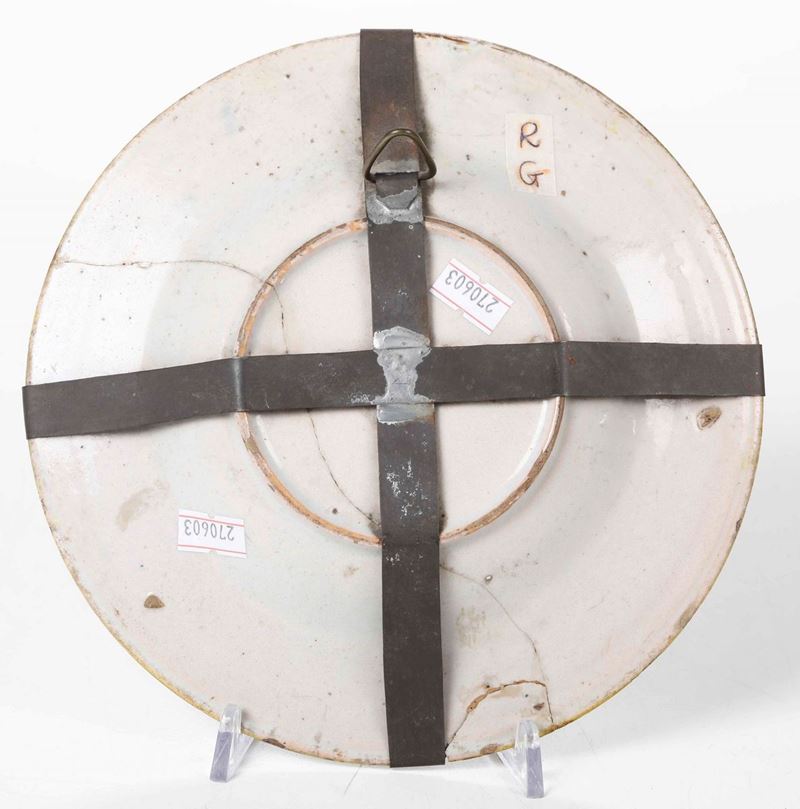 Maiolica. Diametro cm 21. Conservazione: rotto in due frammenti, più uno piccolo alle ore 6-7, e rincollato