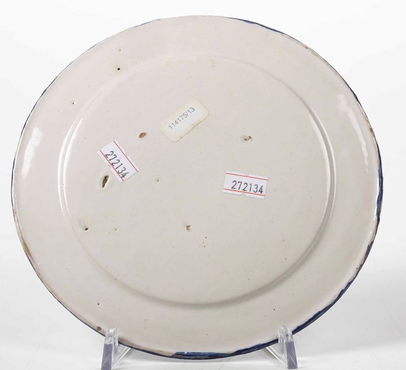 Maiolica decorata con colori a gran fuoco. Diametro cm 18,7. Conservazione: ottima