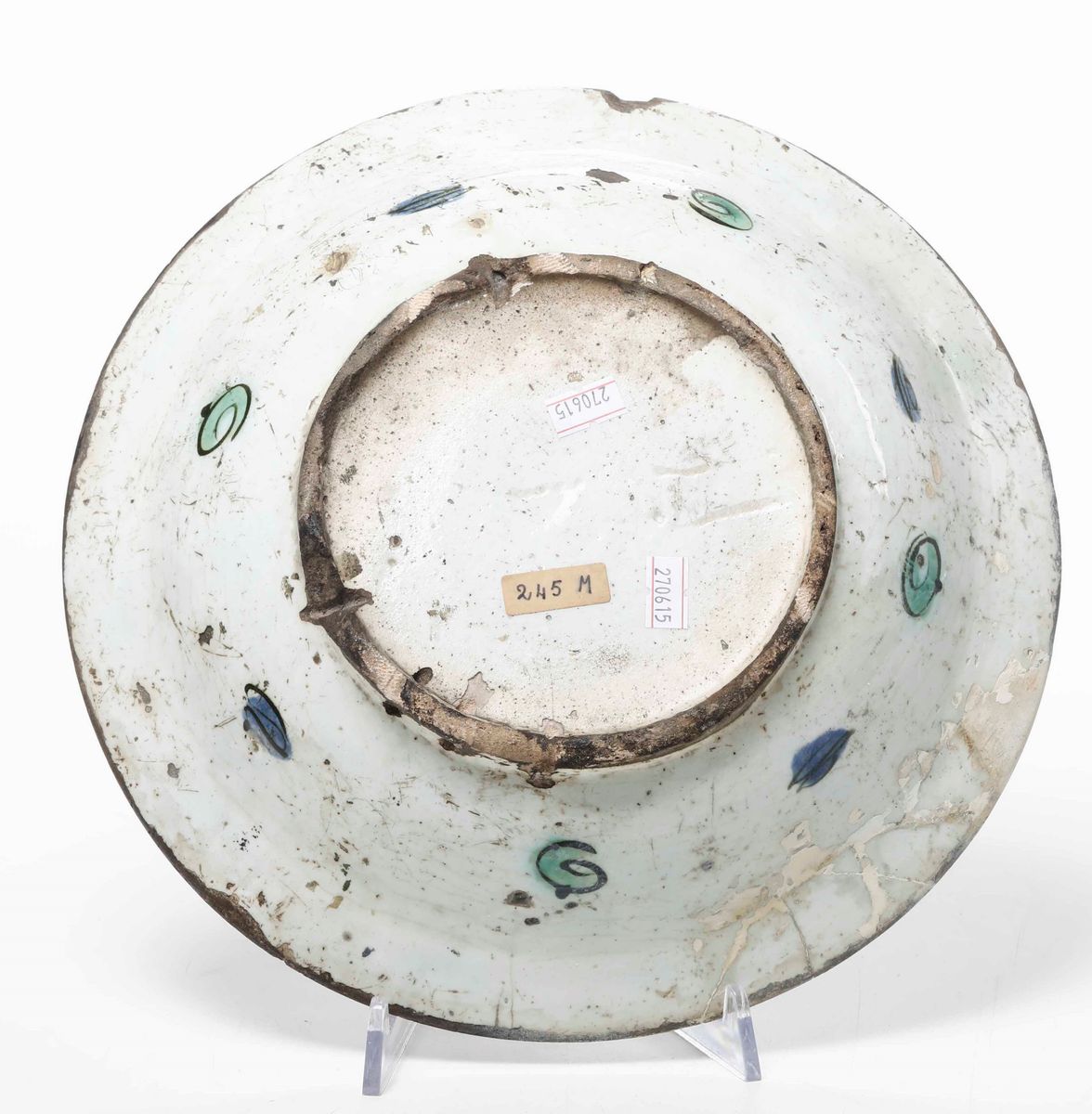 Ceramica invetriata silicea. Diametro cm 29. Conservazione: rottura sulla tesa tra le ore 6 e le ore 8 con integrazioni; usure al bordo.