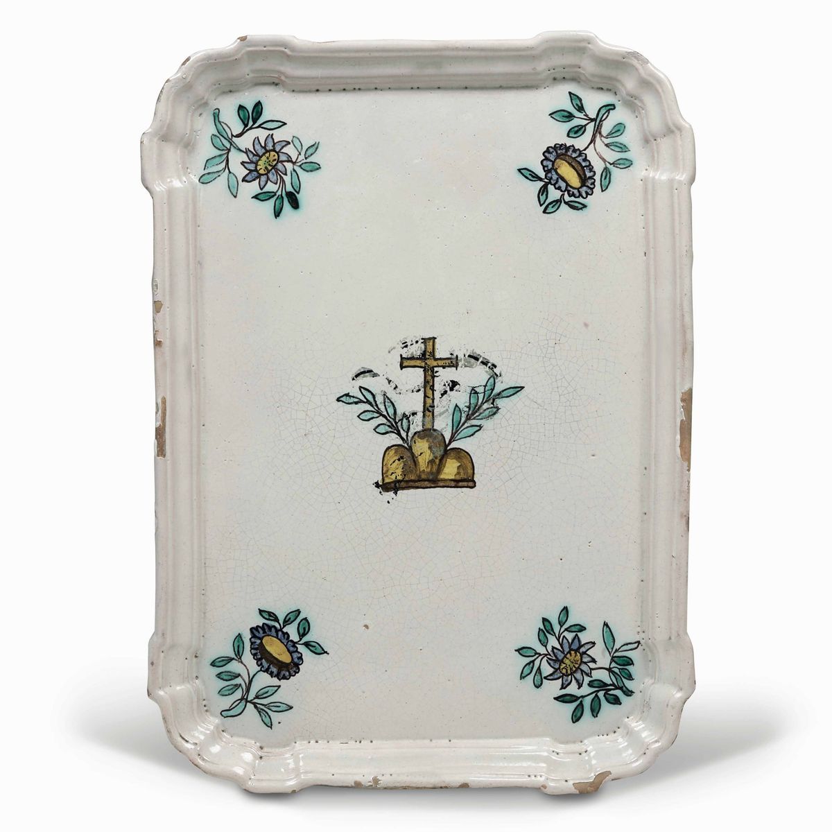 Vassoio di forma rettangolare con cornice profilata ad angoli smussati. Al centro presenta l’emblema olivetano, mentre ai quattro lati è dipinto un fiore.