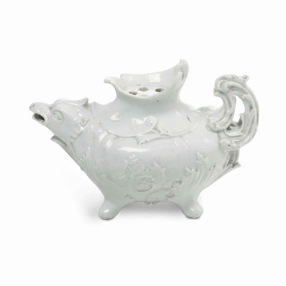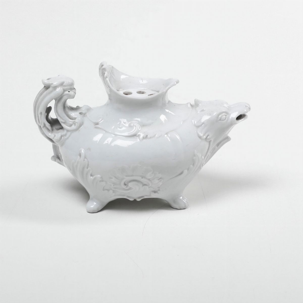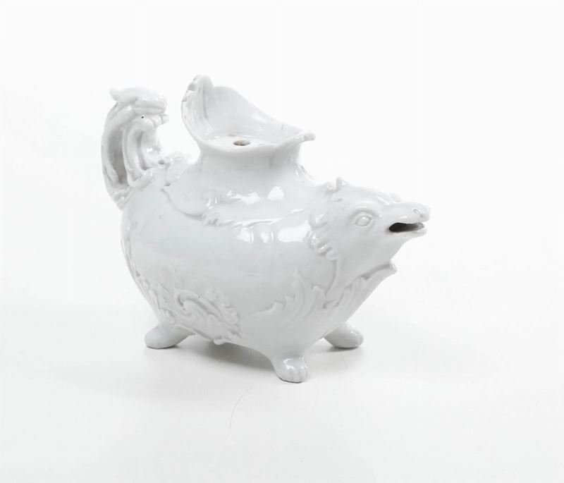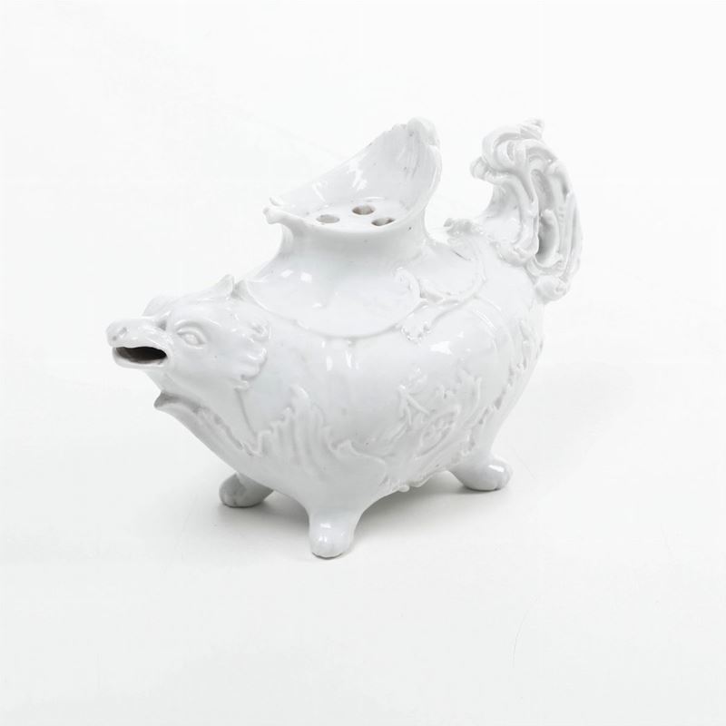 L’inusuale contenitore, a forma di animale fantastico con il beccuccio modellato a testa di uccello, è decorato a rocailles in rilievo che richiamano la caffettiera bianca conservata a Palazzo Rosso a Genova e quella conservata nella Collezione Lokar (cfr. A.D’Agliano, Porcellane italiane dalla collezione Lokar, Milano 2013, p. 74, n. 26)