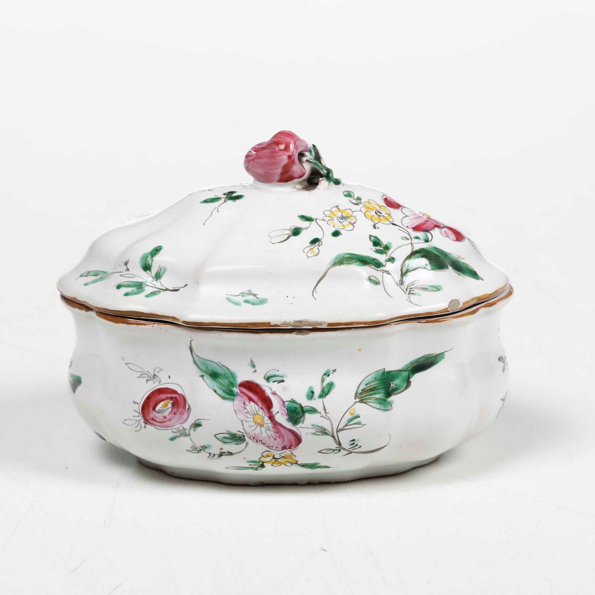 Maiolica a piccolo fuoco. Marca: assente. Dimensioni: altezza cm 9,5; cm 12,6x8,8. Conservazione: ottima; insignificanti salti di smalto al bordo del coperchio. Provenienza: Antichità Orsi Milano, come risulta da etichetta cartacea