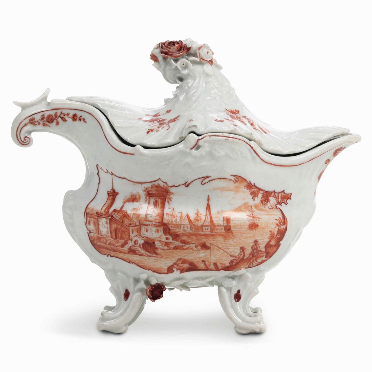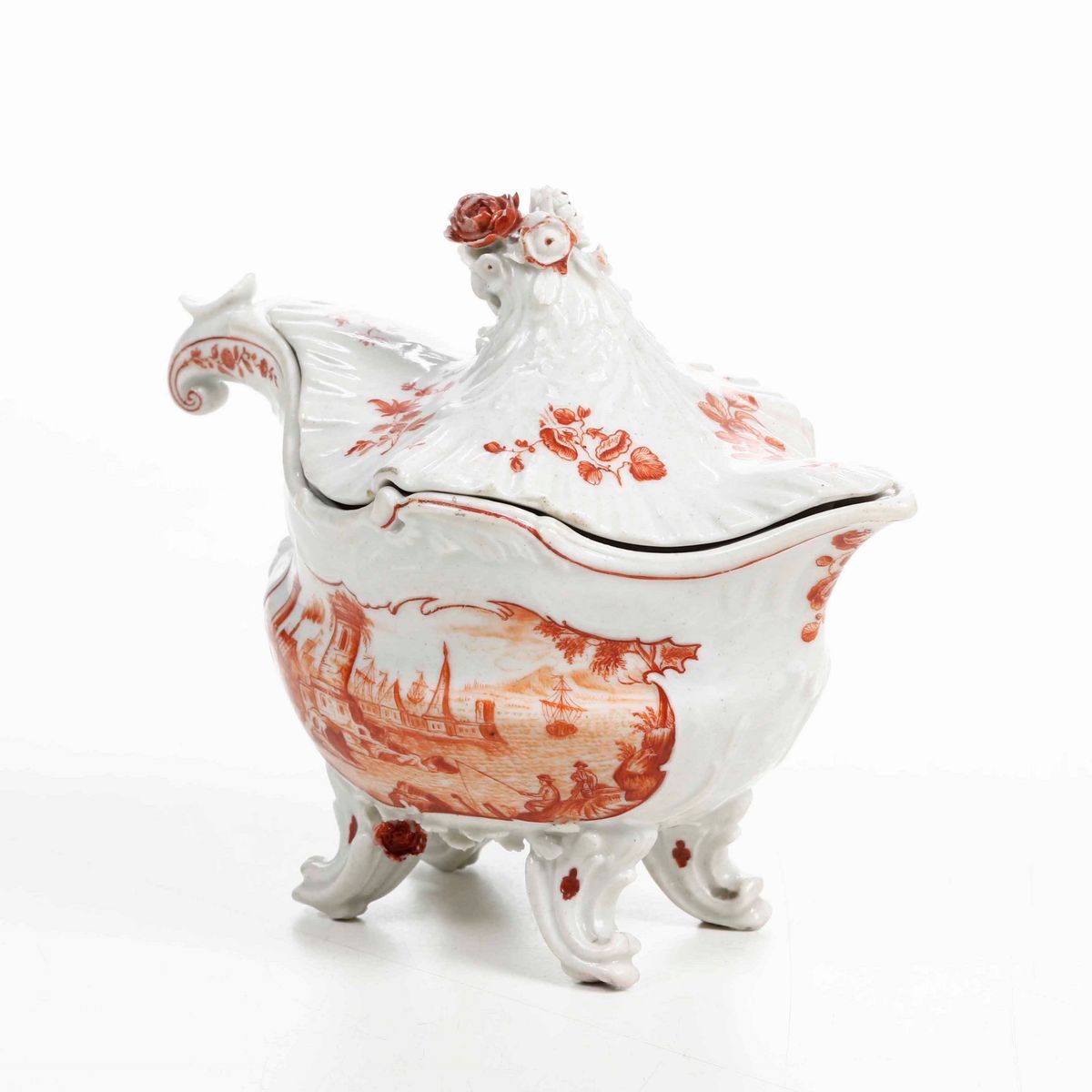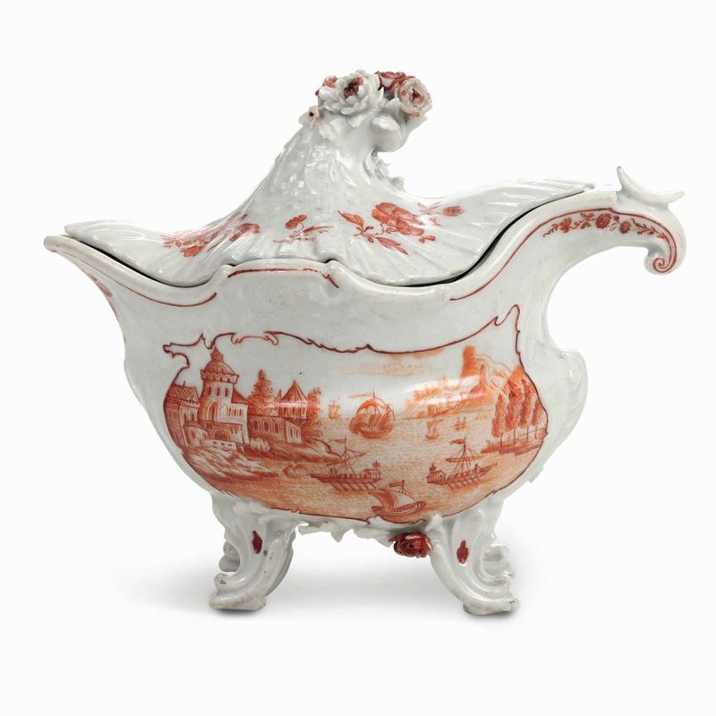 Di questo modello rococò si conoscono solo due zuppiere, forse tentativi perché la manifattura Antonibon non ha mai sfornato serviti da tavola in porcellana, ma solo in maiolica: la zuppiera bianca priva di coperchio, che stata esposta alla storica mostra veneziana del 1936 (vedi N.Barbantini, Le porcellane di Venezia e delle Nove, Venezia 1936, Tav. LXIX, fig. 205; anche in G. Morazzoni, Le porcellane italiane, I, Milano 1960, Tav. 104 b); la zuppiera decorata a fiori policromi che è stata esposta nel 1954 a Vicenza, Palazzo Bonin (vedi G. Barioli, Maioliche Porcellane e Terraglie del Vicentino, Catalogo della Mostra 1955, fig. 24)
