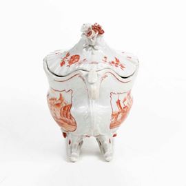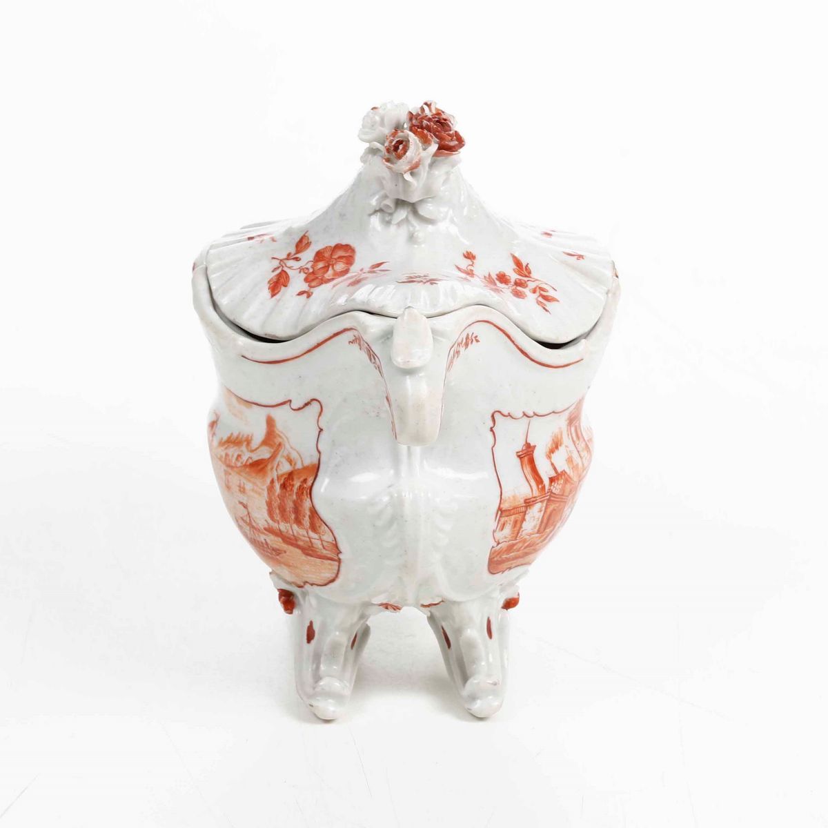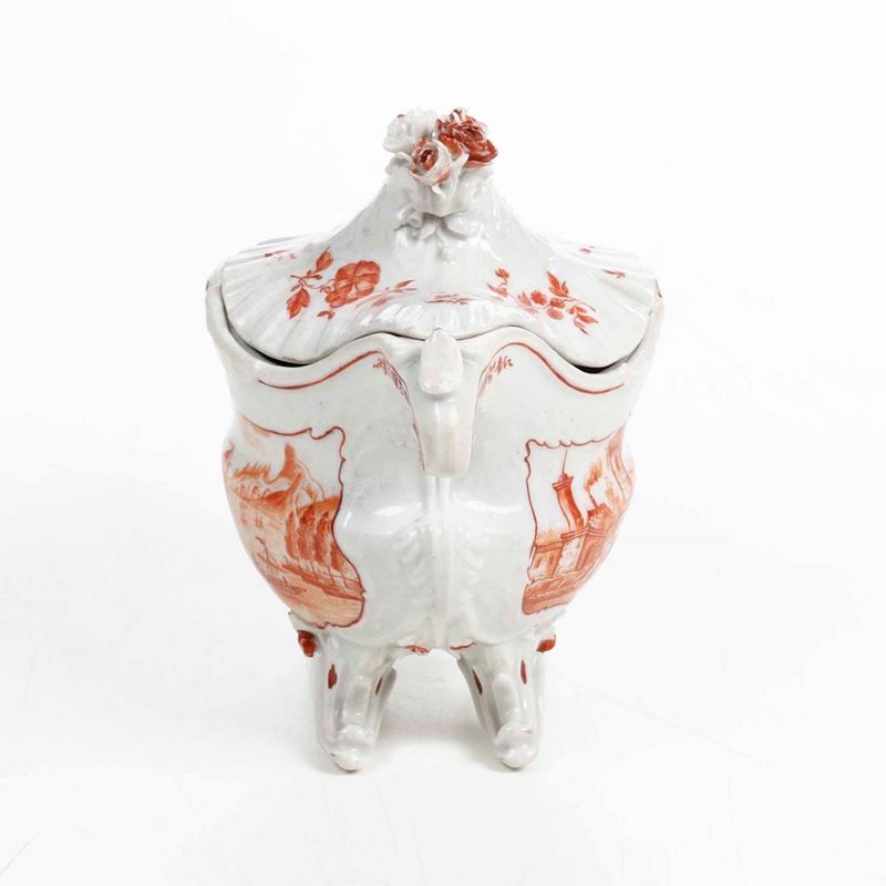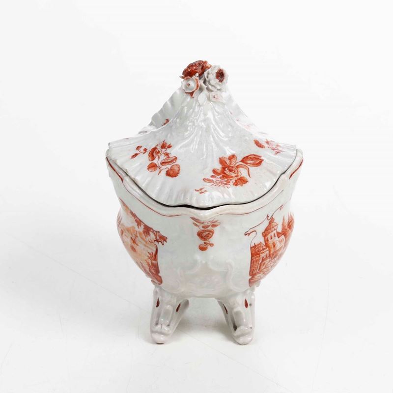 La nostra zuccheriera è l’unica di questo modello pervenutaci. Su alti piedini a rocailles poggia il corpo dalle linee rococò con il bordo superiore molto mosso e il coperchio che termina con un esuberante presa ricurva ricoperta di piccole rose rosse e bianche. Due grandi riserve mistilinee ospitano paesaggi marini animati, con grandi edifici e navi miniati e abilmente dipinti in monocromia rosso ferro