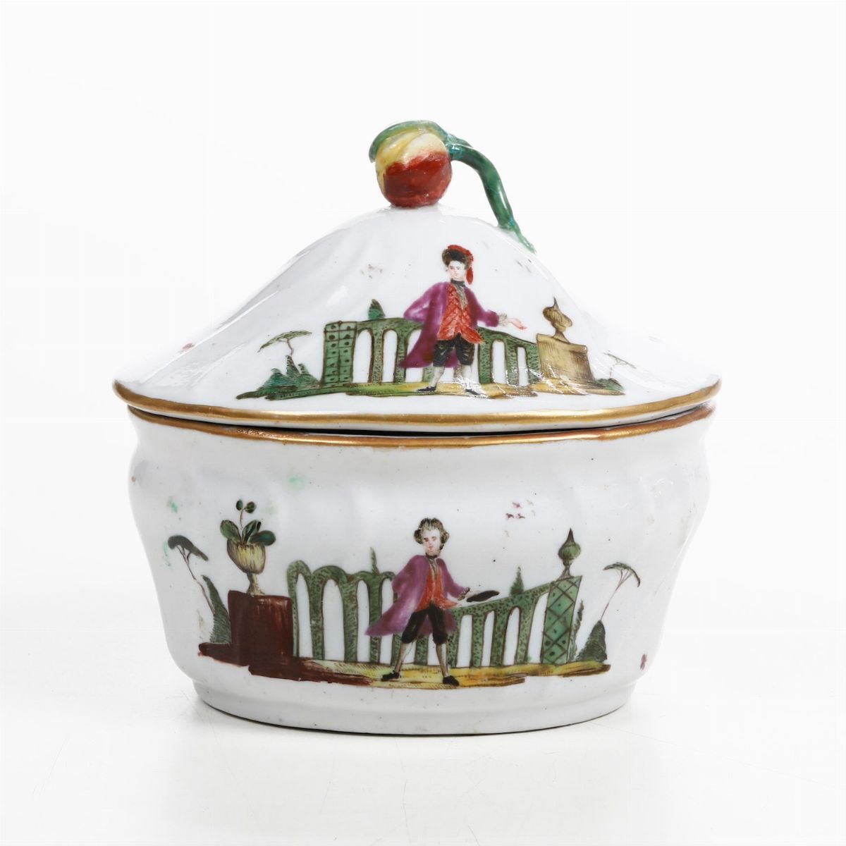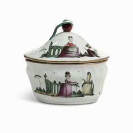 Dalla forma a sezione ovale con pareti leggermente costolate e coperchio a pagoda dalla presa a fruttino, è dipinta in policromia con un raro motivo a figure di dame e gentiluomini in giardini veneti a “bersò” e con i tipici pini marittimi di Cozzi