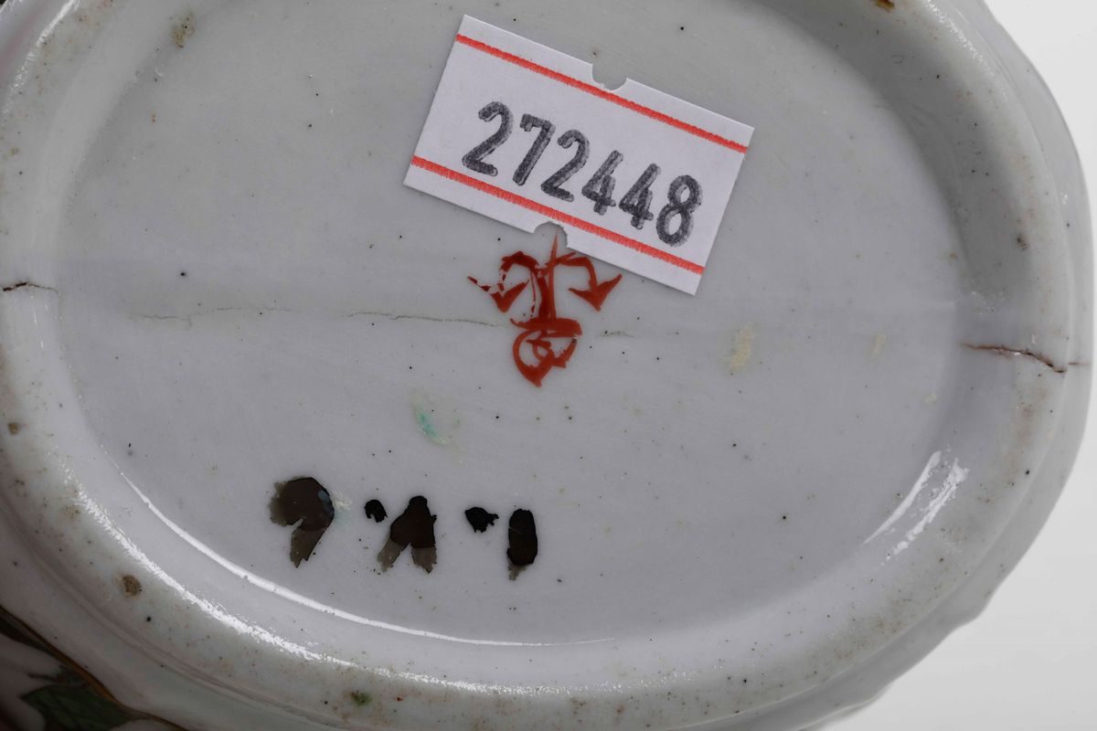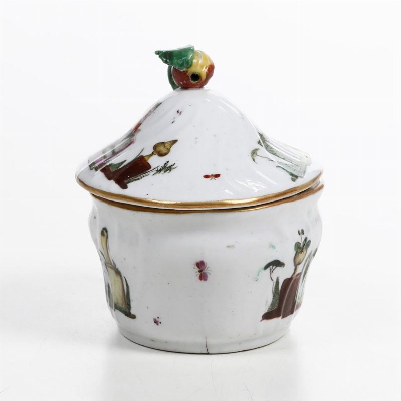 Porcellana policroma. Marca: ancora in rosso. Dimensioni: altezza cm 9,5; cm 10,1 x 8,4 . Conservazione: restauri alla presa del coperchio