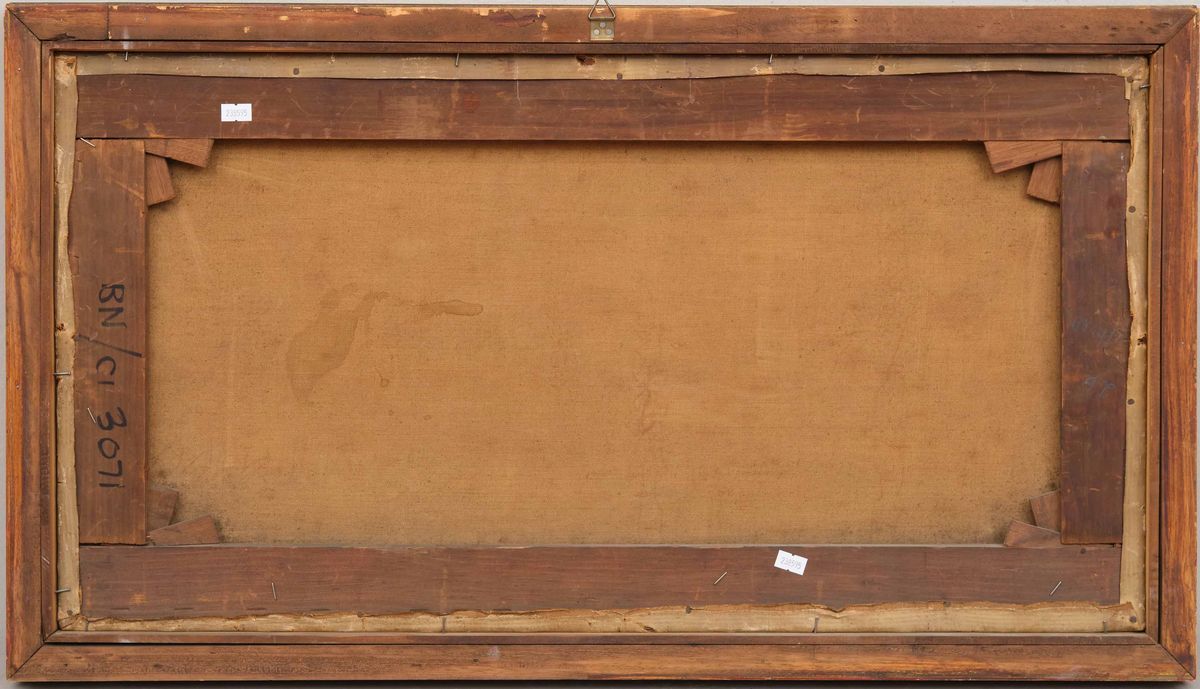 Olio su tela, cm 40x77 (craquelure diffusa sulla superficie).