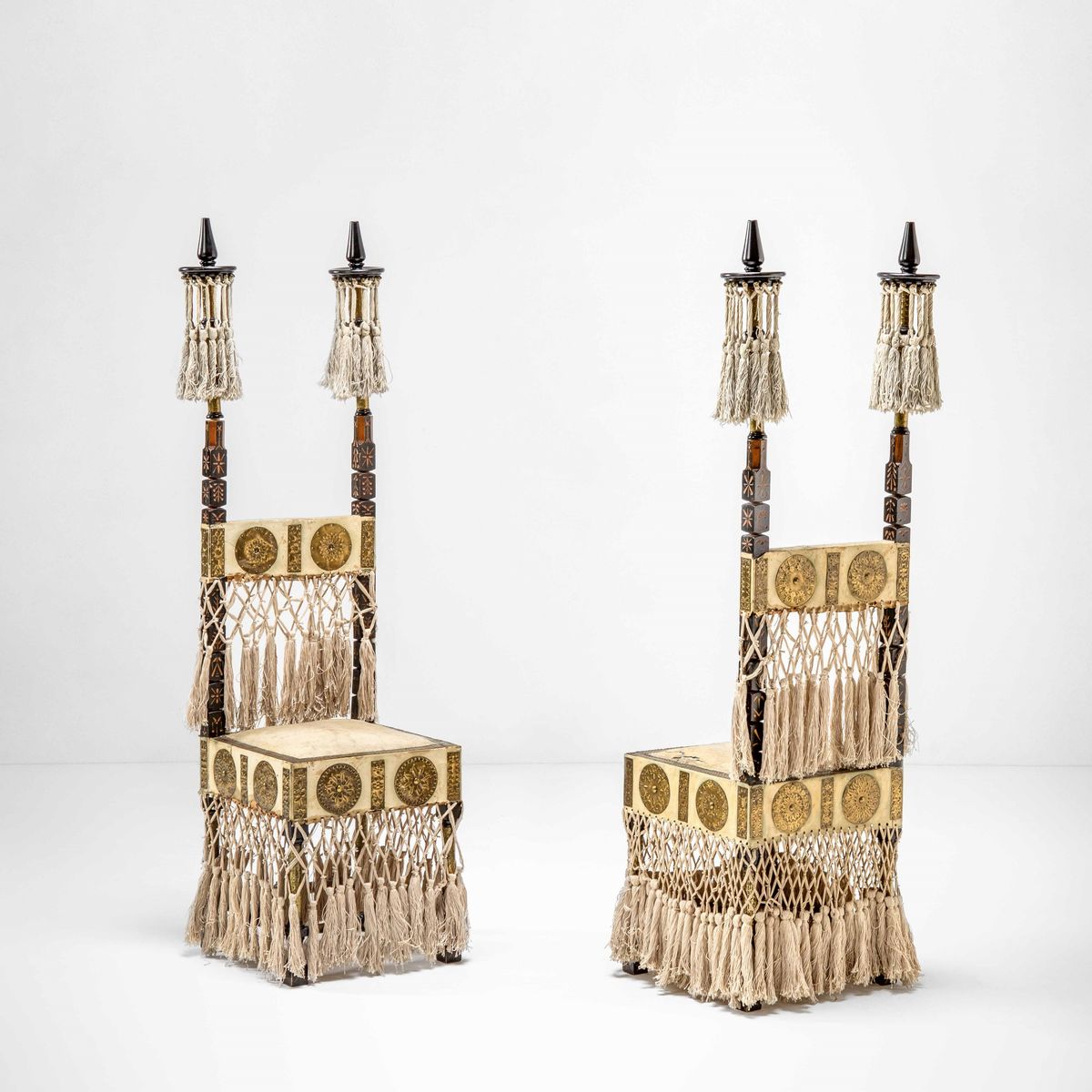 Struttura in legno ebanizzato, dettagli in pergamena e rame sbalzato. Frange in passamaneria.