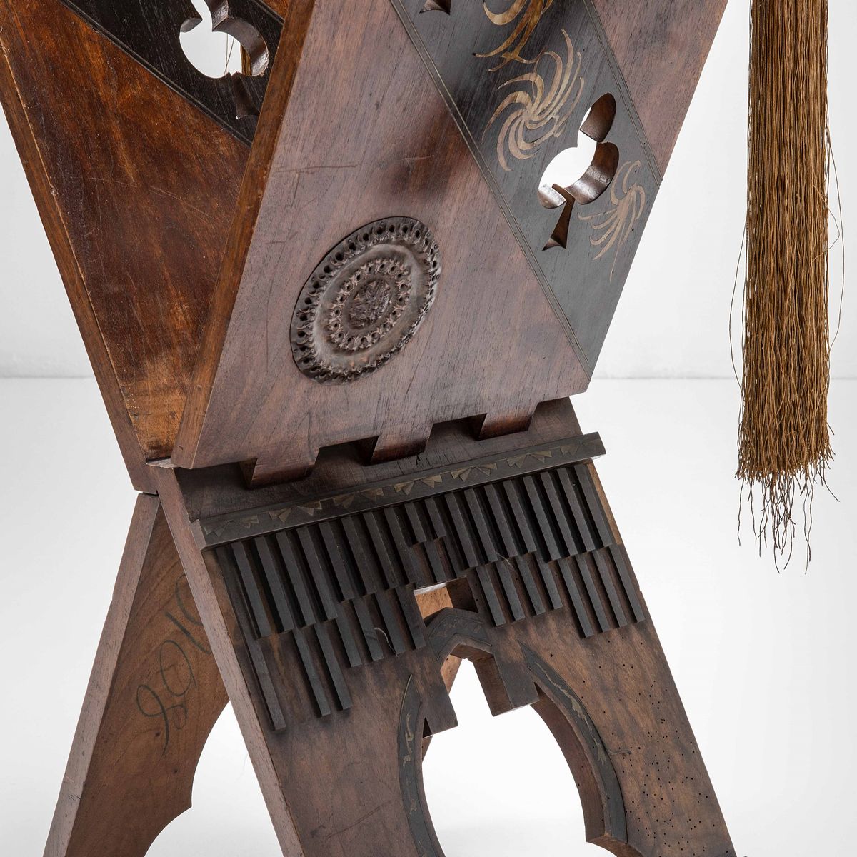 Struttura in legno ebanizzato, dettagli in rame sbalzato e passamaneria.