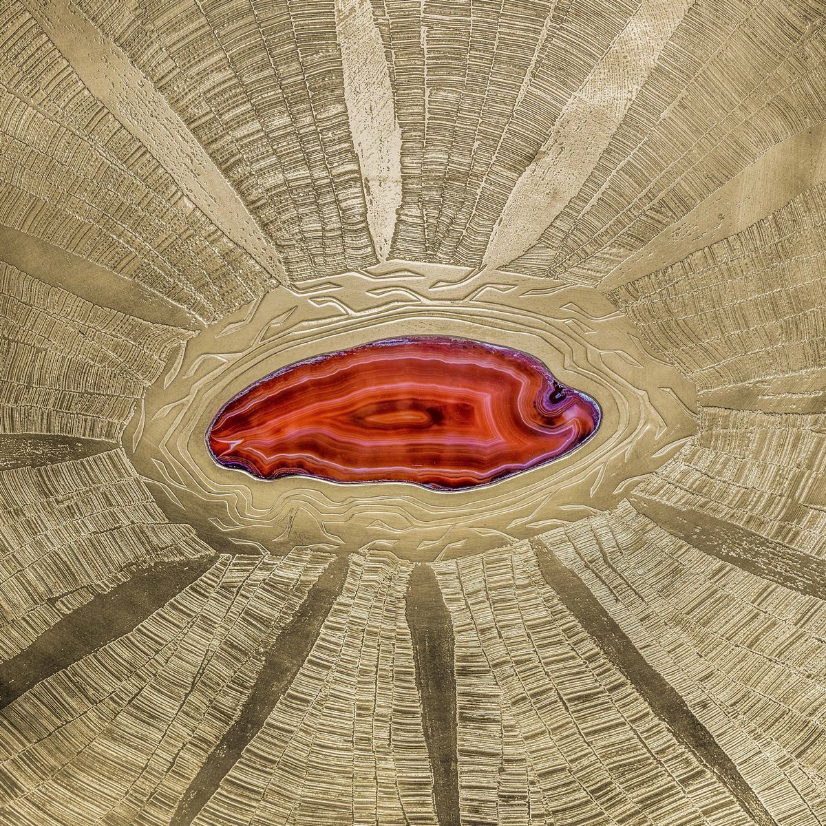 Piano con struttura in legno e rivestimenti in ottone lavorato all’acido con inclusione centrale in agata. Base in legno con rivestimenti in ottone e in laminato.