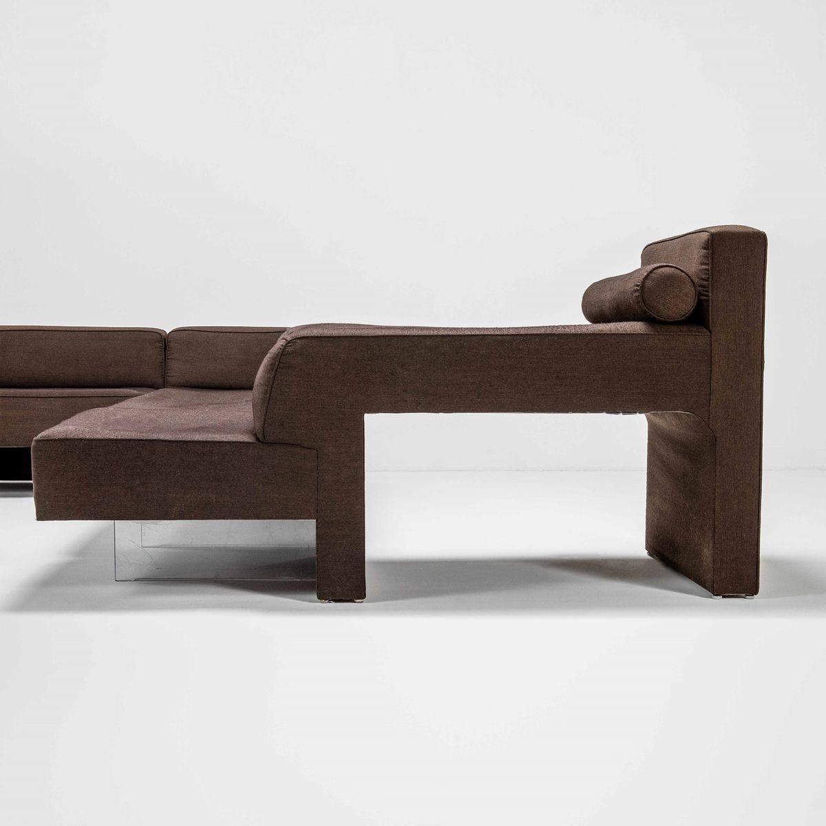Struttura in metallo e sostegni in lucite. Rivestimenti in tessuto.