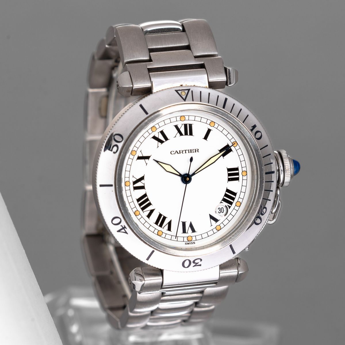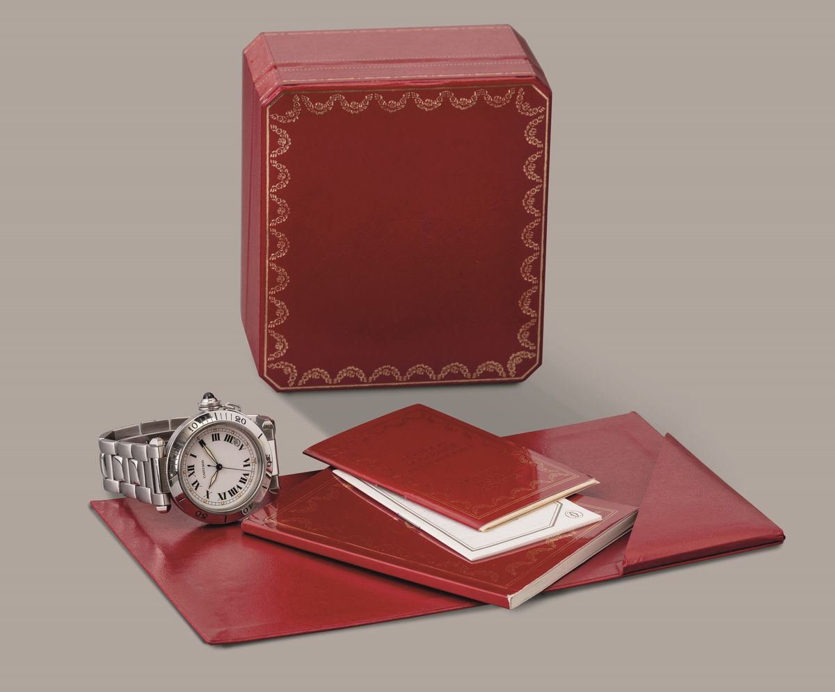 CARTIER - Pasha, in acciaio, automatico, misura grande, quadrante bianco con numeri Romani e luminescenza al trizio, con scatola originale