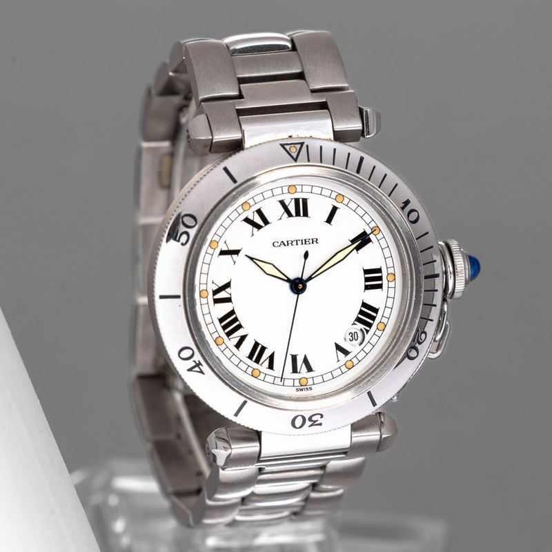 CARTIER - Pasha, in acciaio, automatico, misura grande, quadrante bianco con numeri Romani e luminescenza al trizio, con [..]