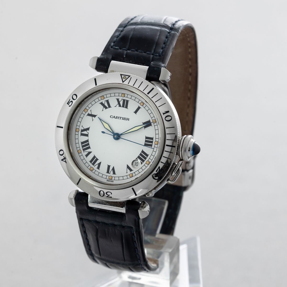 CARTIER - Pasha in acciaio, quadrante bianco numeri Romani con datario, movimento automatico e chiusura deployante