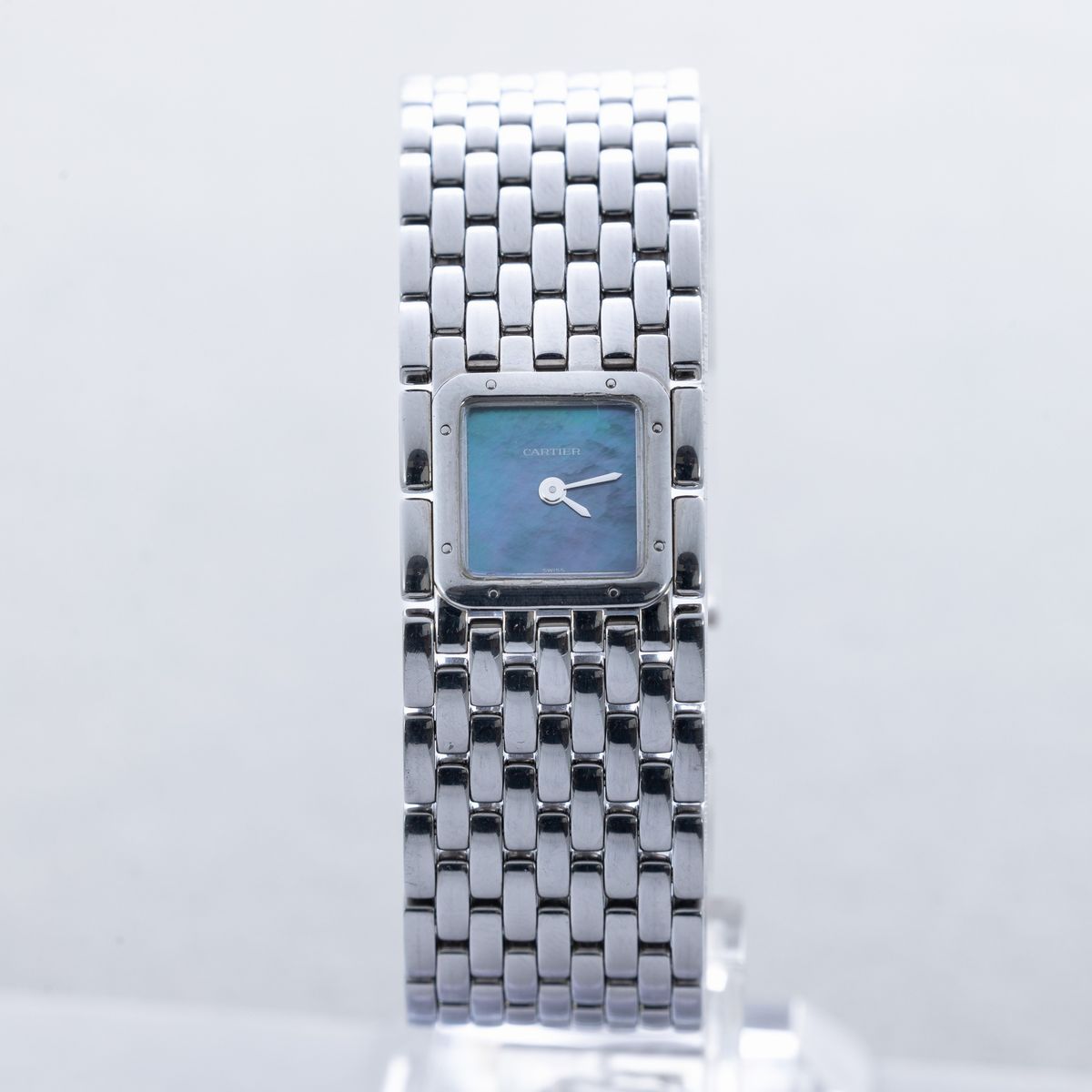 CARTIER - Ruban, elegante orologio da donna in acciaio, quadrante in madreperla azzurra con lancette bianche movimento al quarzo
