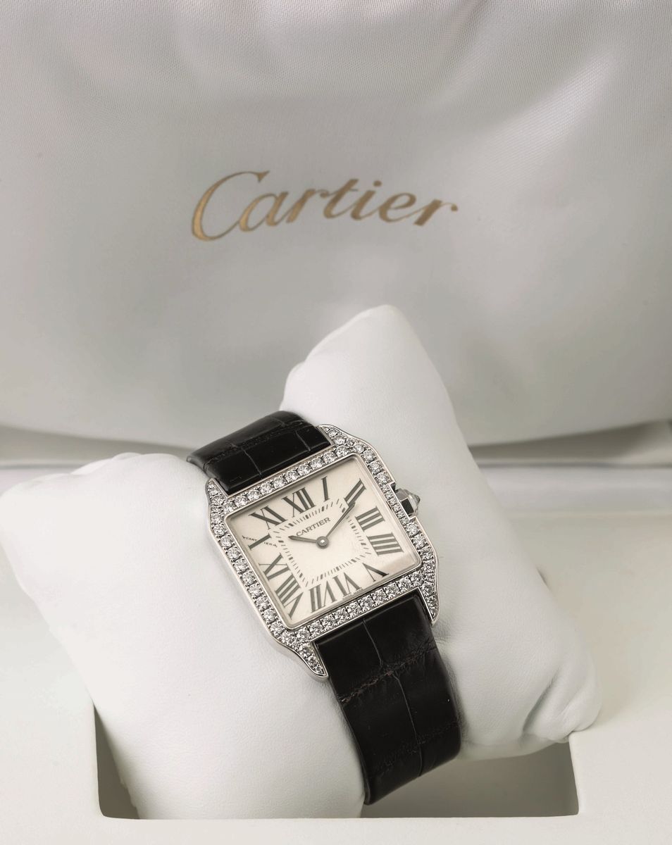 CARTIER - Santos Dumont in oro bianco 18k e diamanti, quadrante argentè numeri romani, movimento al quarzo, cinturino in [..]