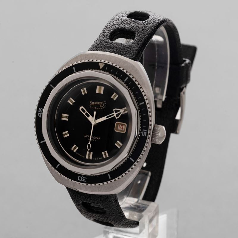EBERHARD - Scafograf Super 500 in acciaio tonneau con ghiera girevole in bachelite, datario e quadrante nero gilt movimento automatico e fondello a vite