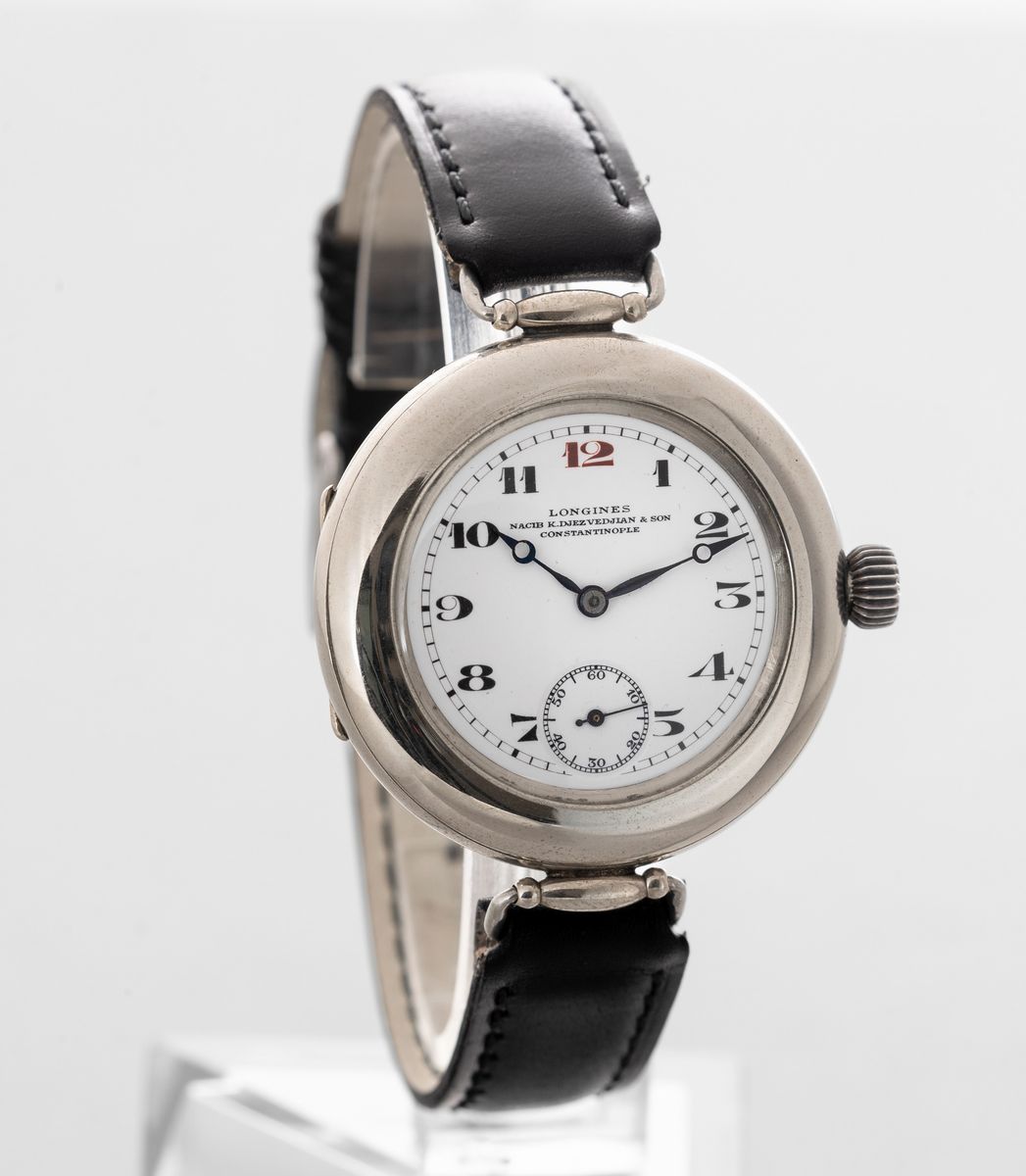 LONGINES - Oversize con doppia cassa a cerniera in acciaio e anse snodate, carica manuale e quadrante in smalto bianco e numeri Breguet con firma del rivenditore di "Costantinopoli"