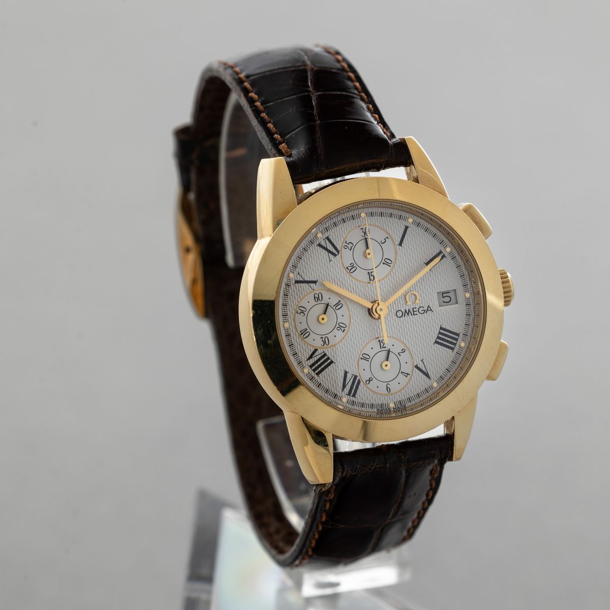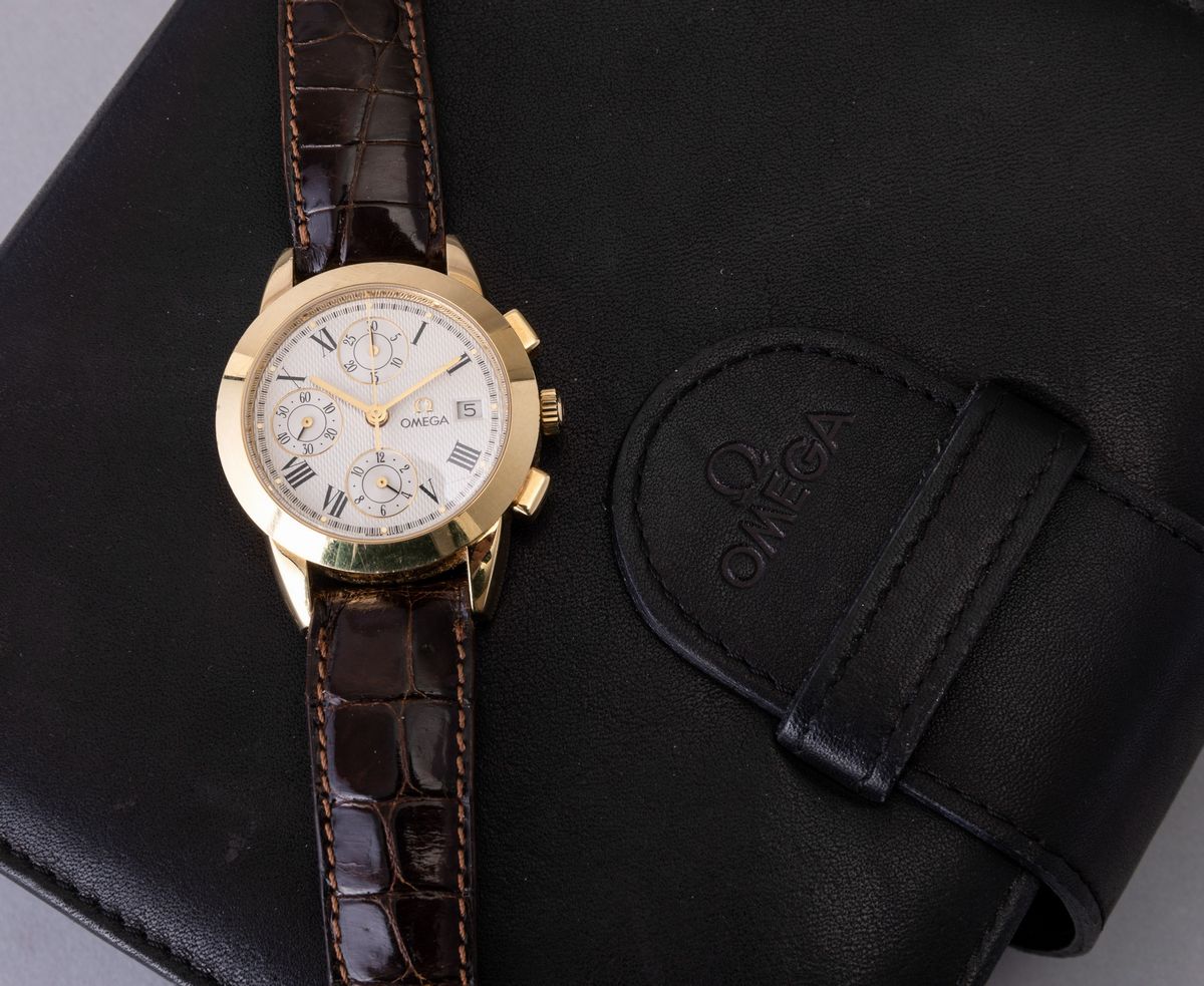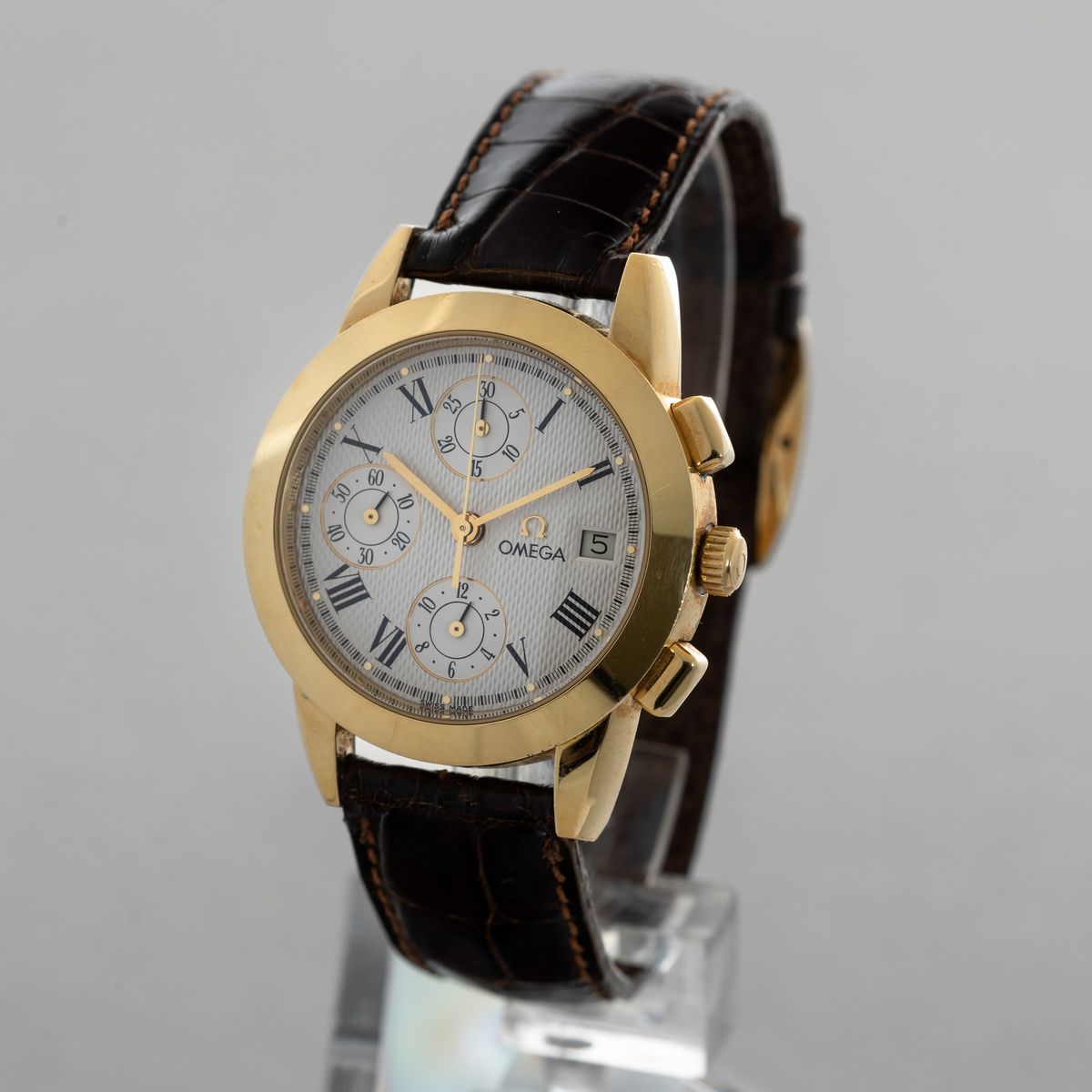 OMEGA - Louis Brandt cronografo tre contatori verticali con datario, cassa in oro giallo 18k, quadrante bianco guillochè [..]