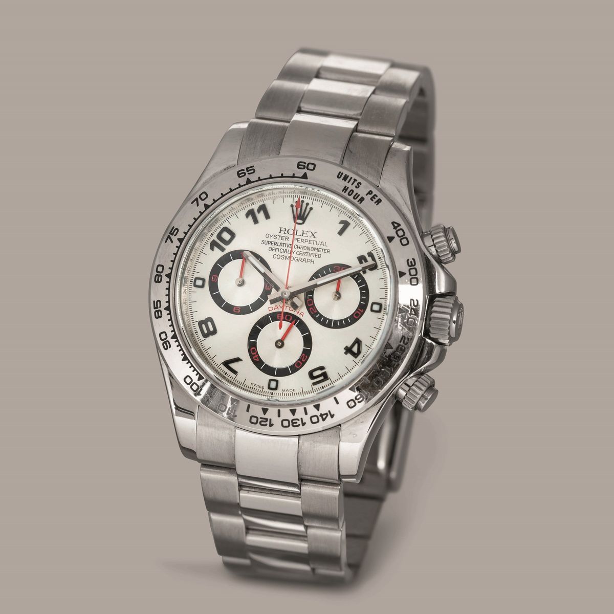 ROLEX - Daytona ref 116509 in oro bianco 18k, quadrante "Racing" bianco con numeri Arabi e contatori in contrasto.