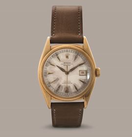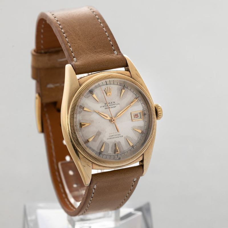 ROLEX - Ovettone Datejust "Officially Red" in oro 18k, quadrante Argentè fanè con indici applicati e finestrella del datario [..]