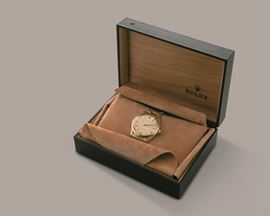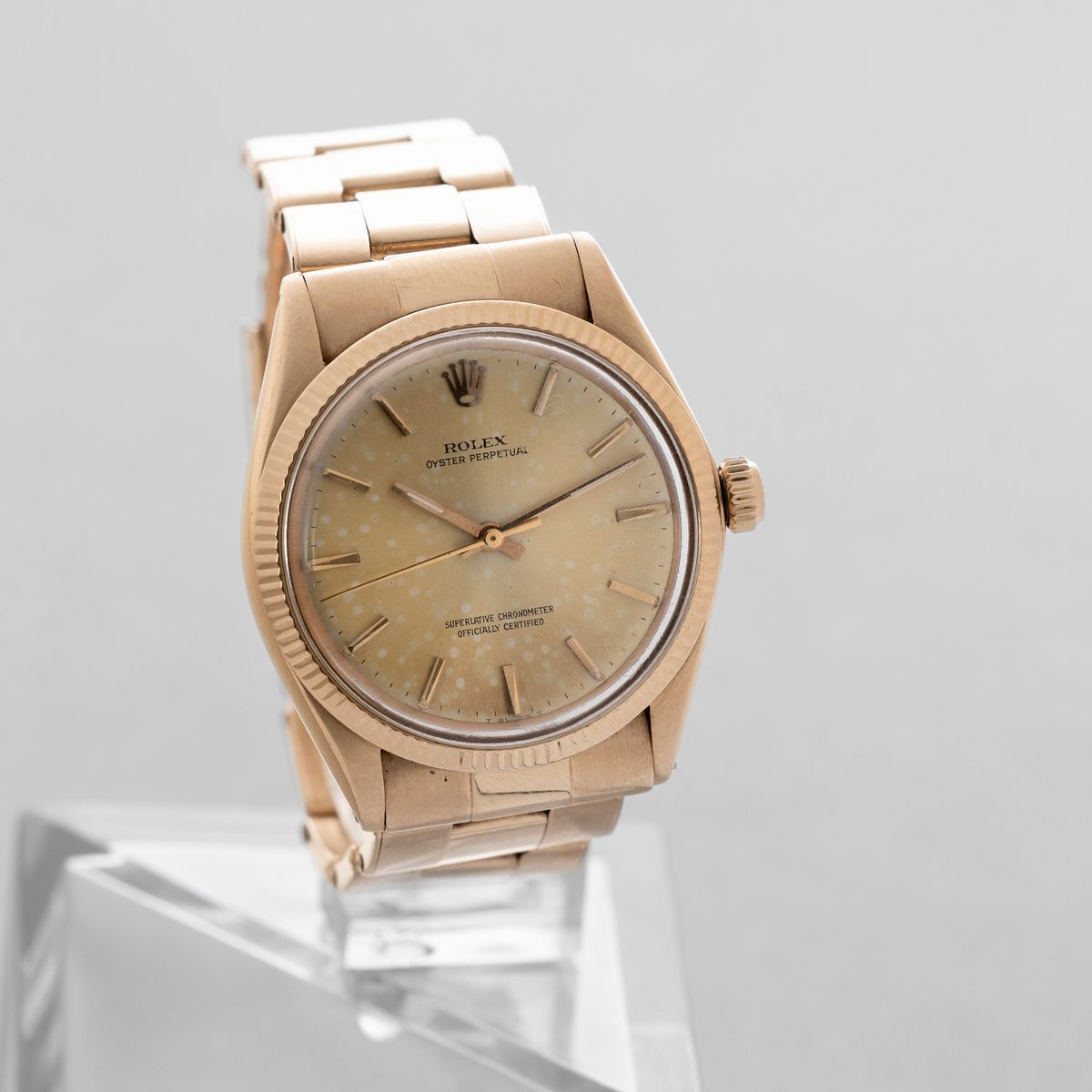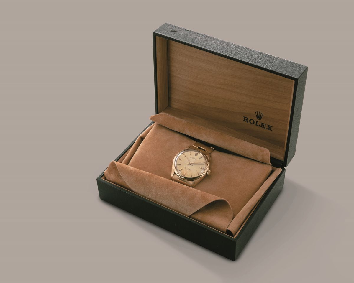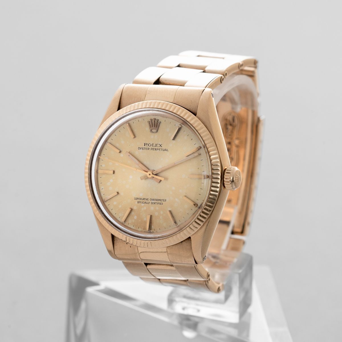 ROLEX - Oyster Perpetual ref 1005 in oro giallo 18k, quadrante champagne, bracciale rivettato, movimento automatico con [..]