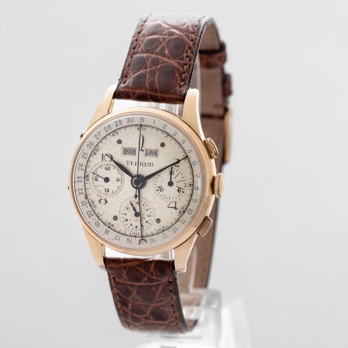 TERIAM - Dato Compax in oro giallo 18k, cronografo tre contatori tasti quadri, triplo calendario, quadrante Argentè, movimento a carica manuale