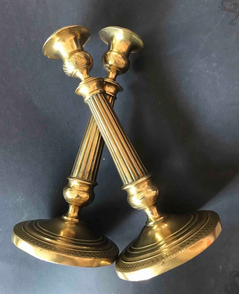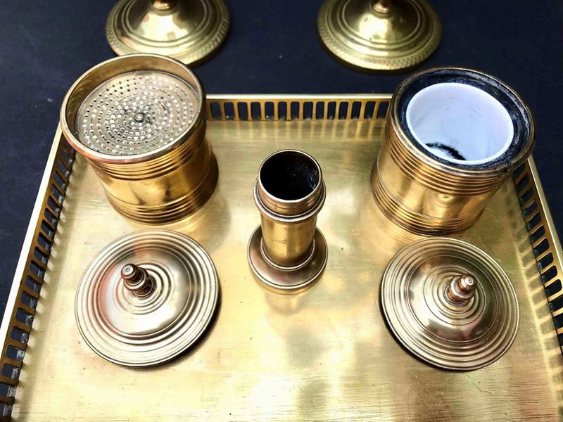 Composto da un vassoio in bronzo massiccio chiuso da un motivo a balaustra e poggiante su piedi a cipolla, portapenne, portapolvere, calamaio e da una coppia di candelieri.Misure vassoio cm 29.5 x 20: H candelieri cm 22
