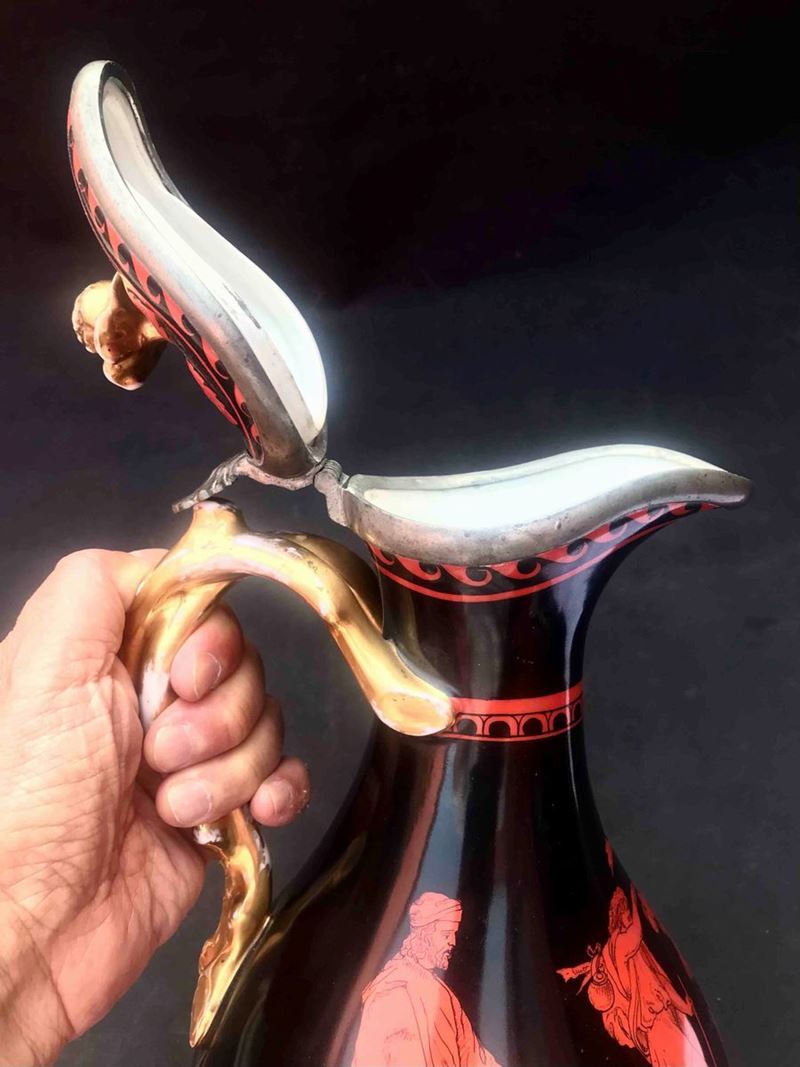 Decorazione di gusto archeologico con figure rosse su fondo nero. Tappo con ghiera in peltro. Qualche consunzione alla doratura del manico dovuta all’uso. Per il resto in perfette condizioni