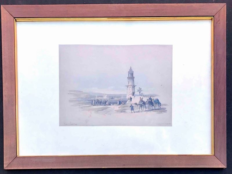 3 litografie acquerellate dall’importante opera Egypt & Nubia, London 1846-1849; litografo Louis Haghe (1806 -1885): 1)Tombs of Calips Cairo 2) Siout Upper Egypt 3) The Nilometer, Isle of Rhoda. Le 3 stampe fanno parte di 270 lito che costituiscono quella che è stata definita “la più importante opera litografica dell’intero XIX° secolo”. In ottime condizioni. In cornice. Tutte firmate in lastra sia dal Roberts che dal litografo Haghe. Misure inclusa cornice: cm 88 x 49,2 ; 68 x 46,7 Data “1839” aggiunta a lapis dal precedente collezionista