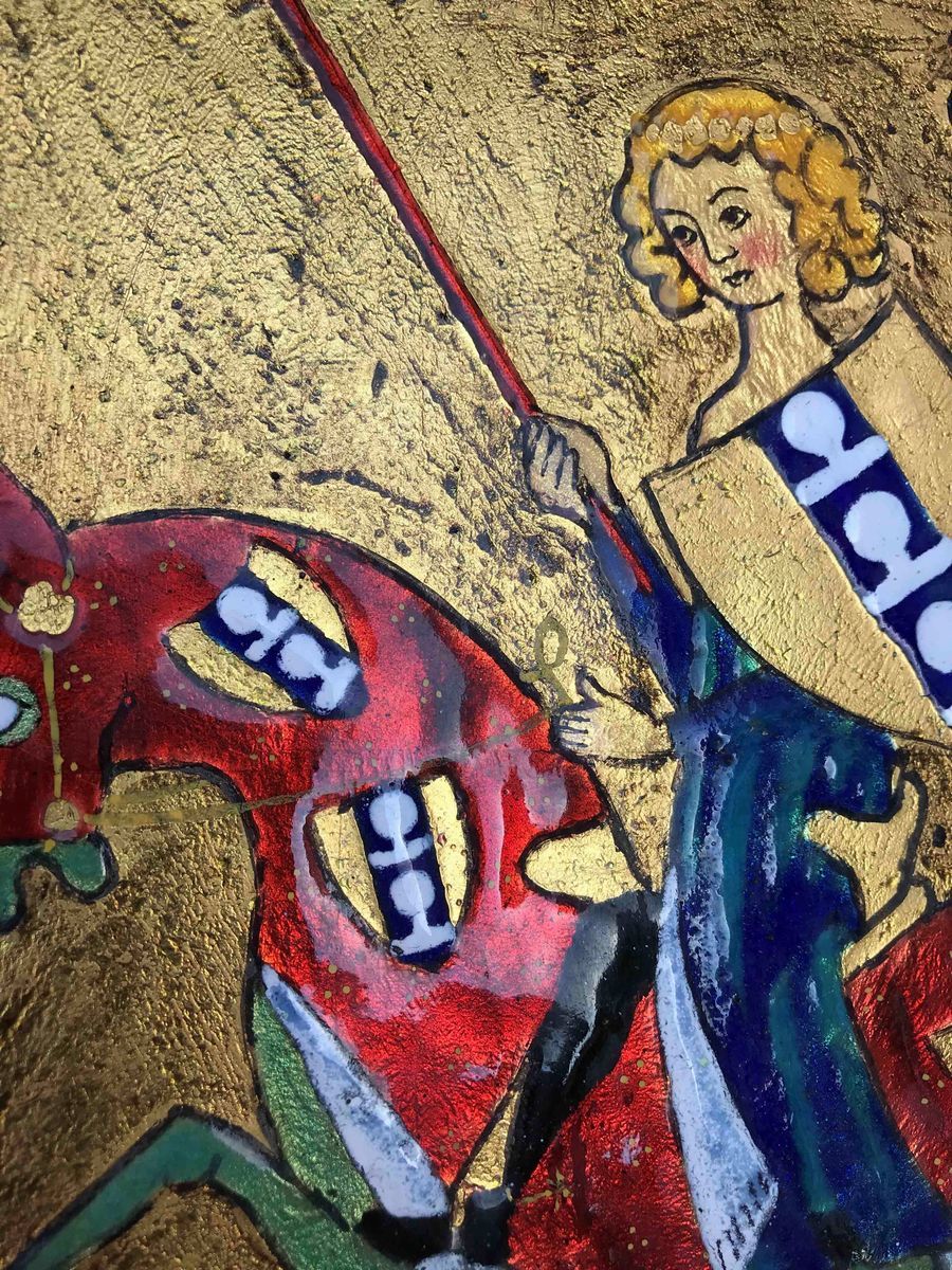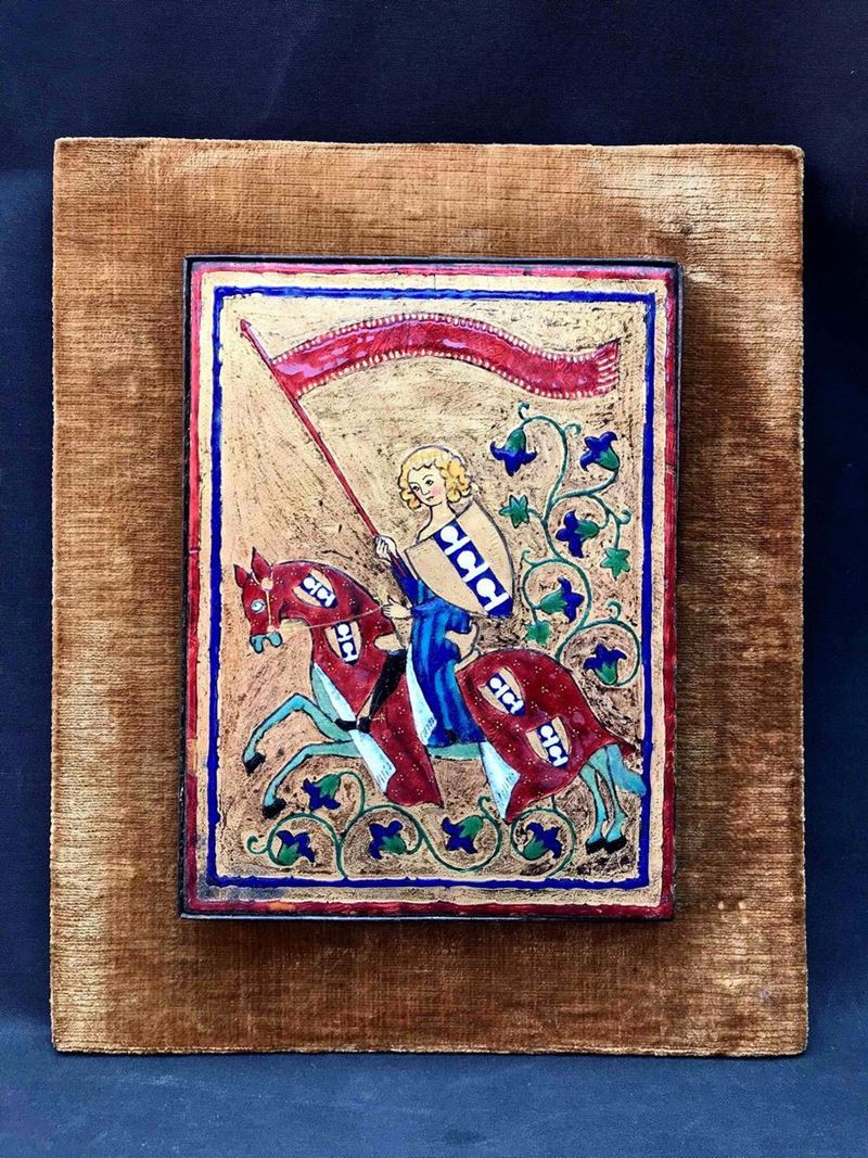 Dipinto a smalto anni'50 Cavaliere medioevale con scudo e stendardo