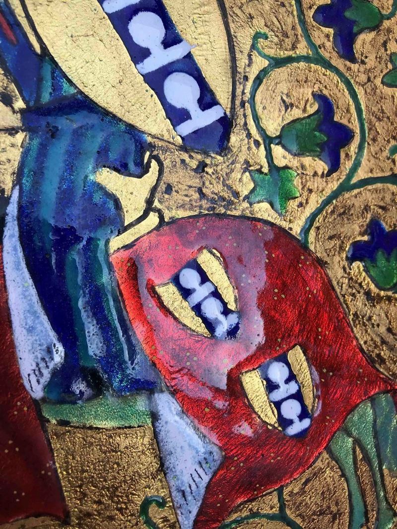smalti su fondo dorato. Montato su pannello di velluto. Misure: cm 21 x 28 parte dipinta; pannello cm 34 x 41
