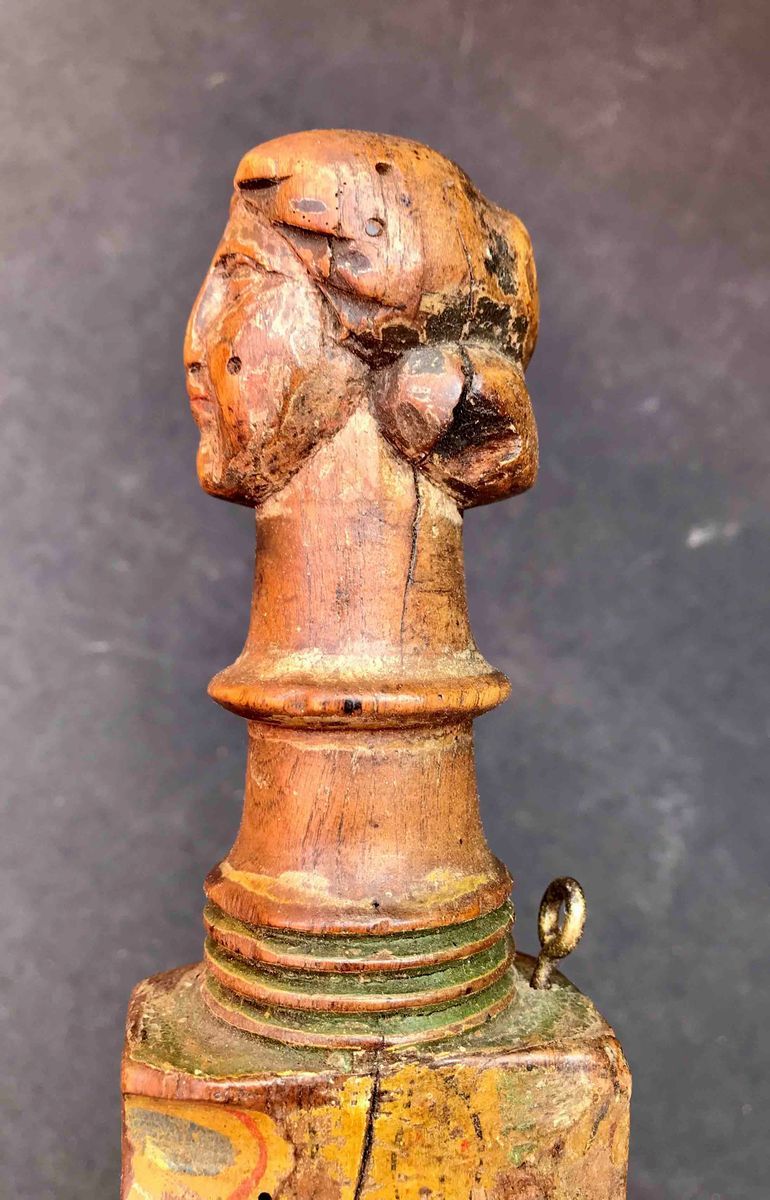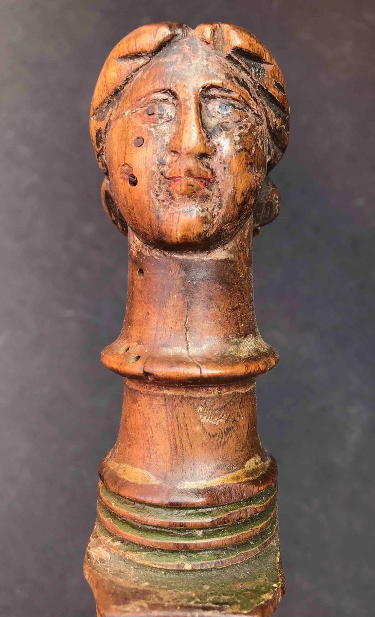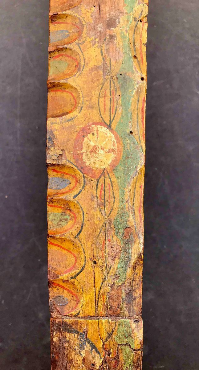 culminante con “testa” scolpita, larghe tracce di colore originale. Lunghezza cm 68