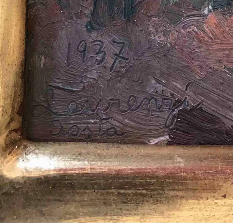 Olio su cartone. Firmato, collocato e datato 1937 in basso a sinistra. Firmato, titolato, datato e dedicato al retro. Entro cornice dorata a foglia. Misure: olio cm 22,5 x 17,1; cornice 23 x 31,5