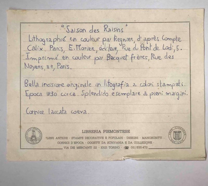 Estate, acquaforte con acquarellatura originale; “L’etoile du berger” litografia in cornice. Impronta cm 55 x 39; cornice 47 x 62 “Saison des raisins” litografia con acquarellatura originale entro cornice dell’epoca marmorizzata. Misure della cornice cm 60 x 46,5