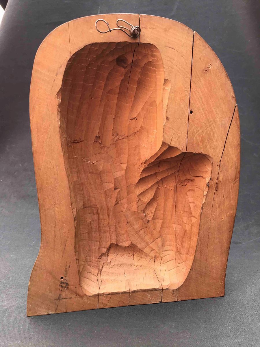 scultura in legno. H cm 31,5 , larghezza cm 23. Alcune filature.
