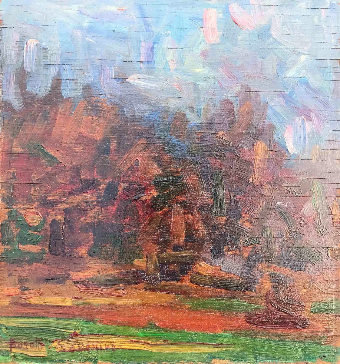 Doppio dipinto, olio su compensato. Lato A) “Paesaggio con chiesa” firmato e datato (19)36 in basso a sx Lato B) “Paesaggio boschivo” firmato per esteso in basso a sx. Misure cm 20 x 22