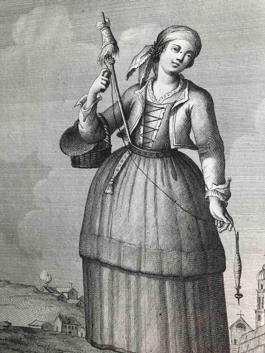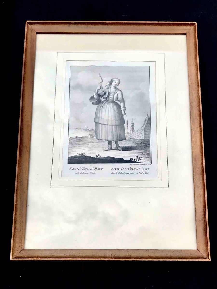 2) Teodoro Viero (1740-1795), Donna del Borgo di Spalato nella Dalmazia Veneta. Da Raccolta di 120 stampe che rappresentano figure ed abiti di varie nazioni secondo le descrizioni dei più celebri recenti viaggiatori opera stampata in Venezia tra il 1783 e il 1791. Misure, inclusa cornice cm 53,3 x 38