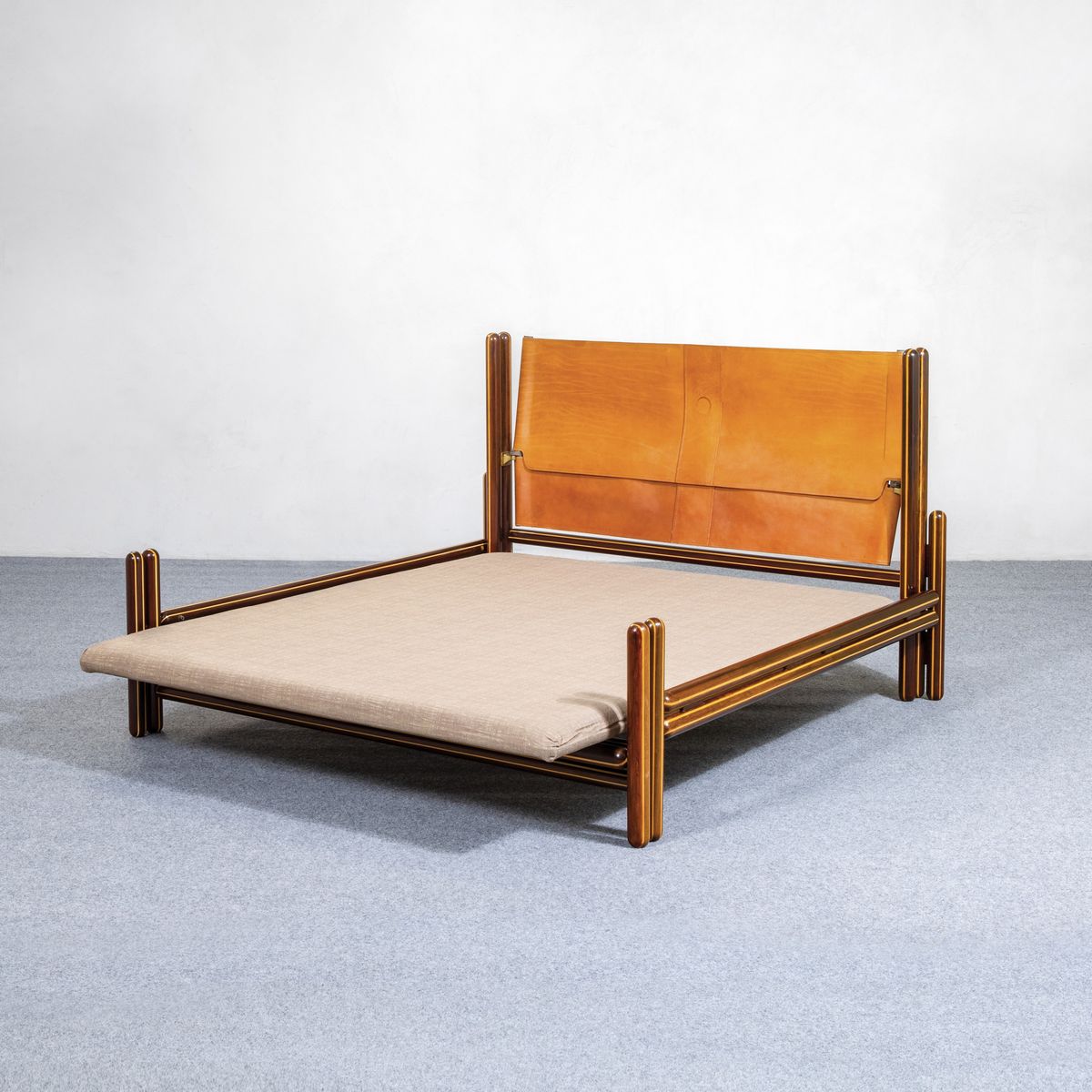 Struttura in cilindri di legno massello e testiera in cuoio.