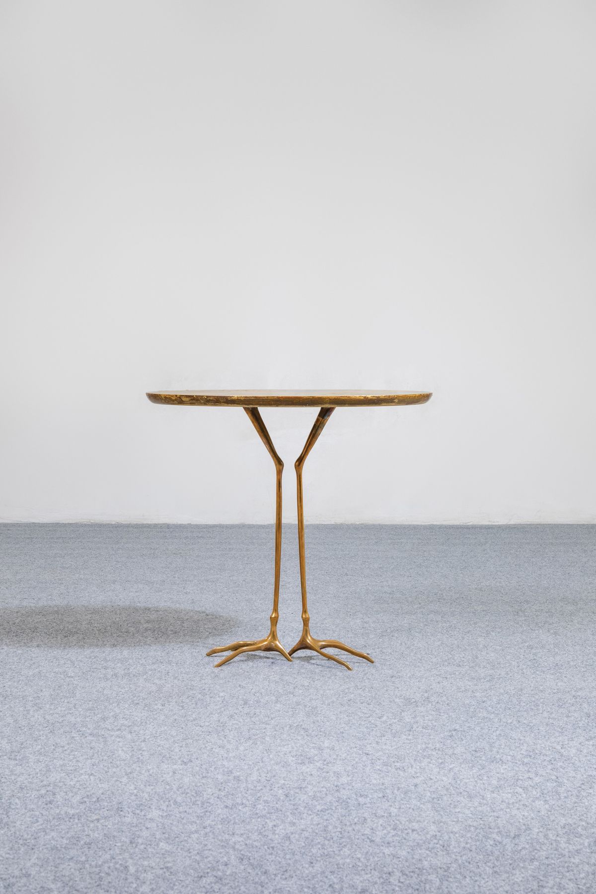 Struttura in fusione di bronzo dorato e piano in legno a foglia oro.