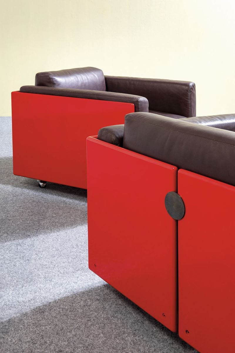 Struttura in legno laccato, cuscini e rivestimenti in pelle.