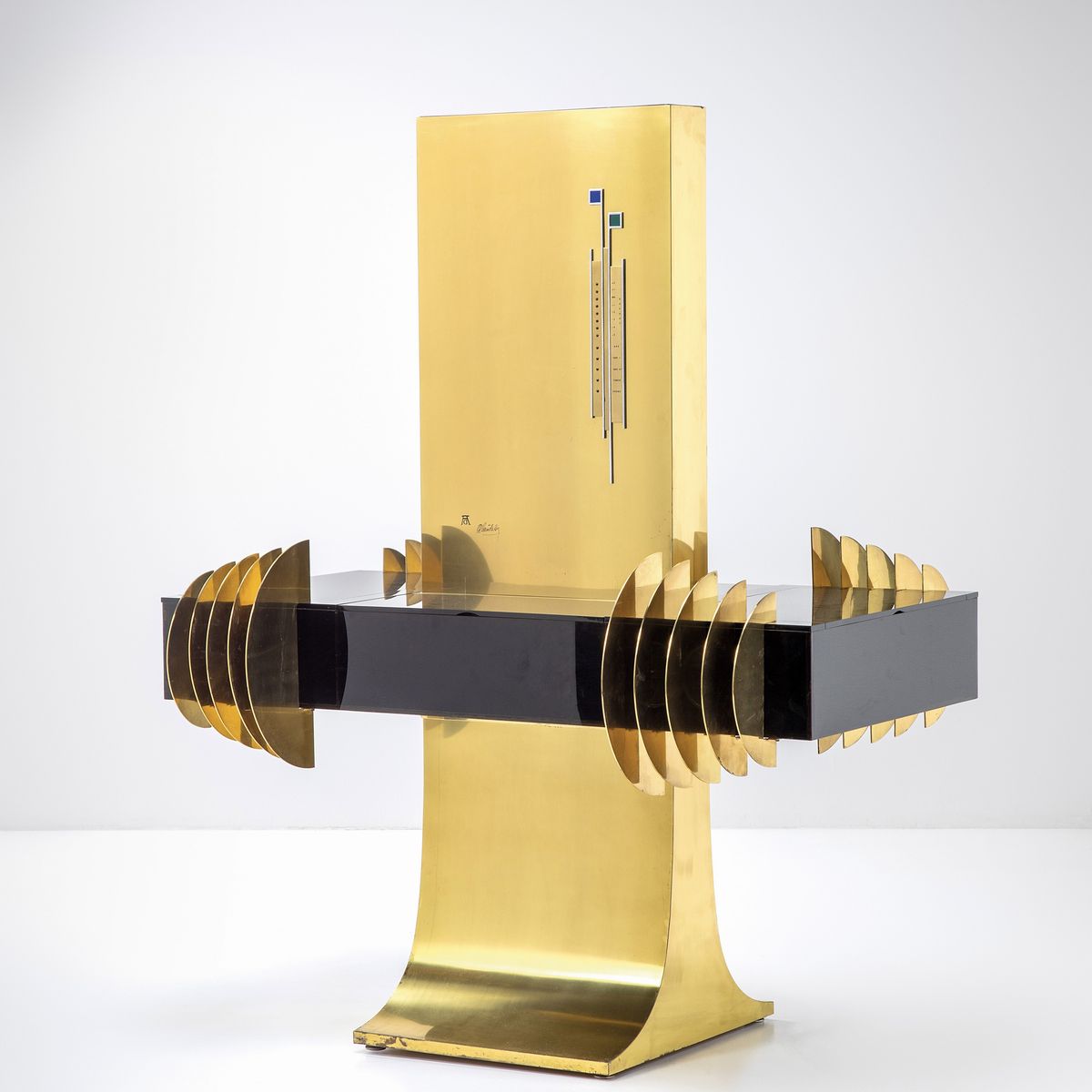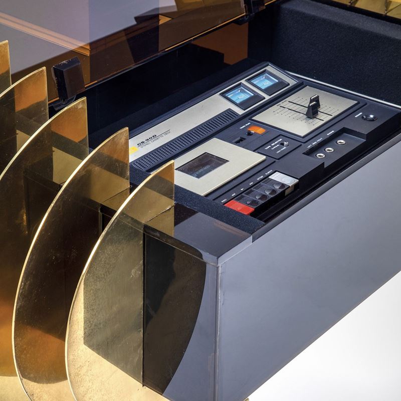 Base e corpo centrale in legno con rivestimenti in ottone. Applicazioni di metalli in rilievo e smalto. Consolle in legno laminato e acrilico semitrasparente a lasciar intravedere le apparecchiature stereo.