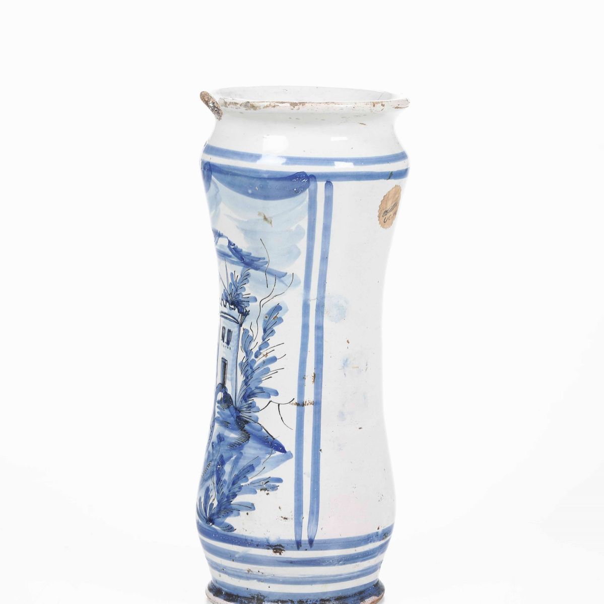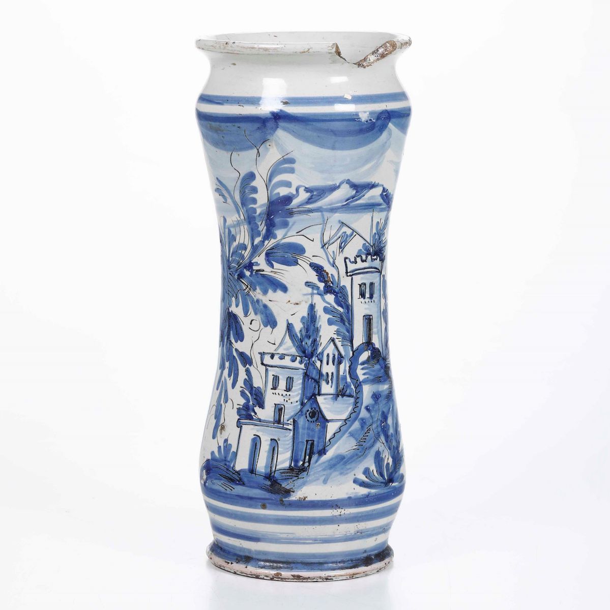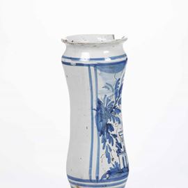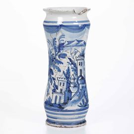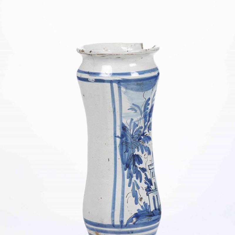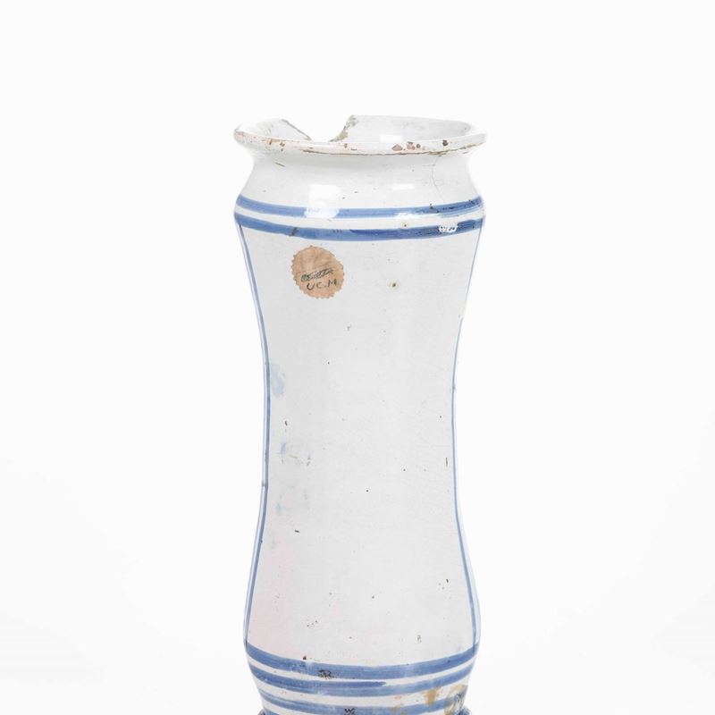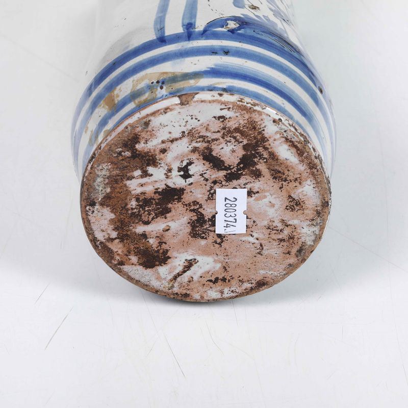 Maiolica monocromia blu e tratti in manganese. Altezza: cm 27,6. Conservazione: mancanza al bordo superiore e insignificante felatura