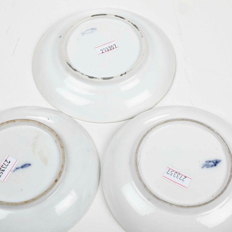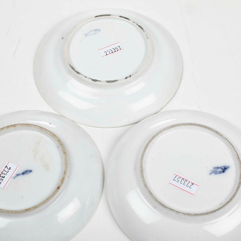 Porcellana. Marca: pesce in blu. Dimensioni: altezza cm 4,5 circa; diametro piattino cm 13,5 circa. Conservazione: una piccola sbeccatura ai bordi di una tazza e di un piattino