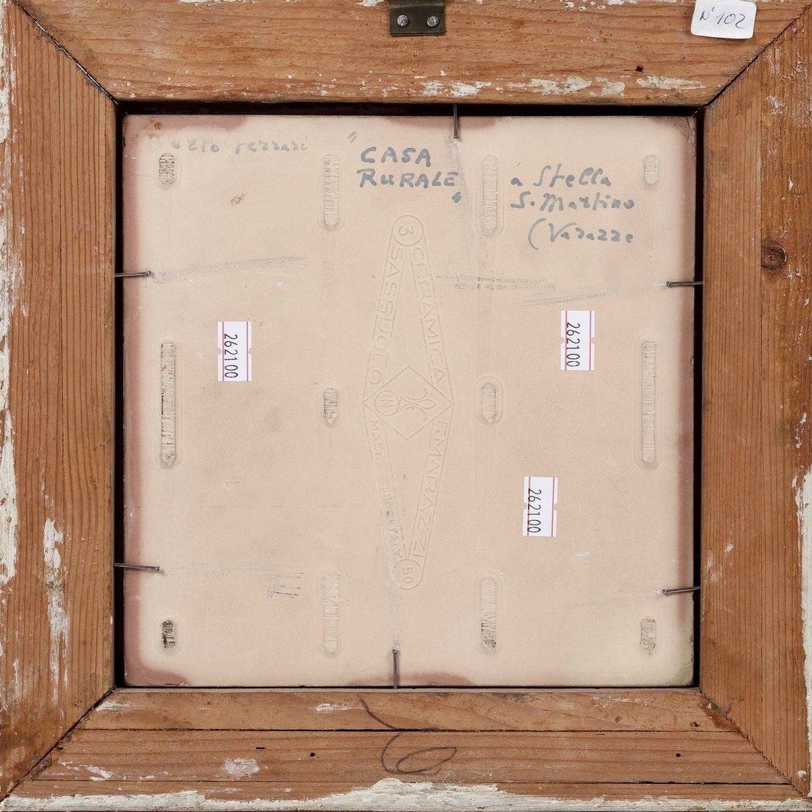 Porcellana dipinta a freddo. Firma: "B.Ferrari" e sul verso "Berto Ferrari Casa Rurale a Stella S. Martino Varazze". Dimensioni piastrella cm 20x20; cornice cm 29,6x29,6. Conservazione: ottima