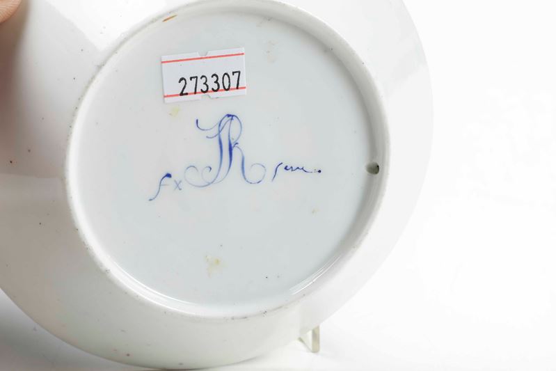 Porcellana policroma e dorata. Marca: "FR" in blu. Dimensioni: altezza tazza cm 6,8; diametro piattino 13,5. Conservazione: usure all'oro della tazza